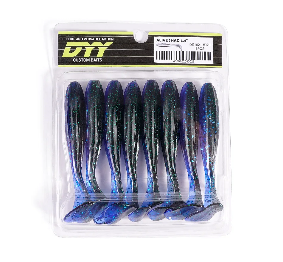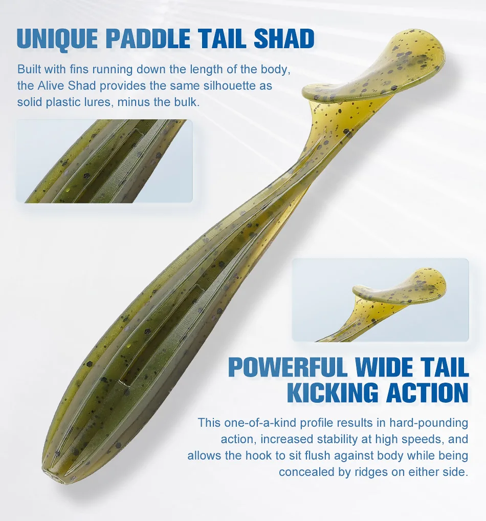 Unique paddle tail shad, built with fins running down the length of the body, the alive shad provides the same silhouette as solid plastic lures, minus the bulk.