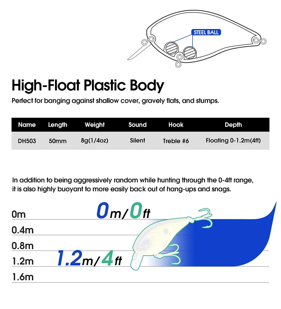 El cebo desviará los obstáculos y se moverá a través de la vegetación mientras mantiene sus movimientos de caza erráticos y su acción dinámica.