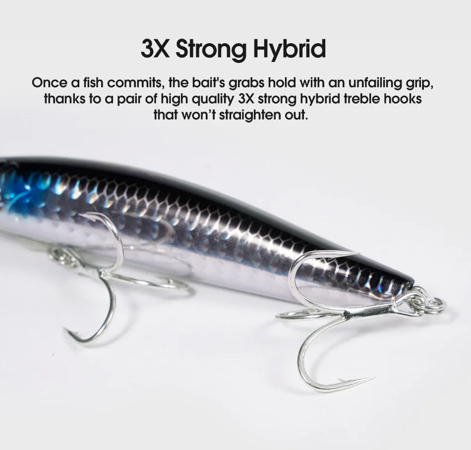 Una vez que un pez se compromete, ¡el cebo se agarra con un agarre infalible! Gracias a un par de anzuelos triples híbridos fuertes de alta calidad 3X que no se enderezan.