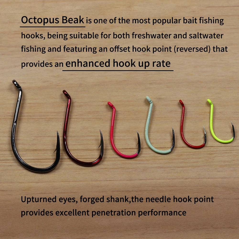 - El pico de pulpo es uno de los anzuelos de pesca con cebo más populares, siendo adecuado tanto para la pesca en agua dulce como en agua salada y cuenta con una punta de anzuelo desplazada (invertida) que proporciona una tasa de enganche mejorada.