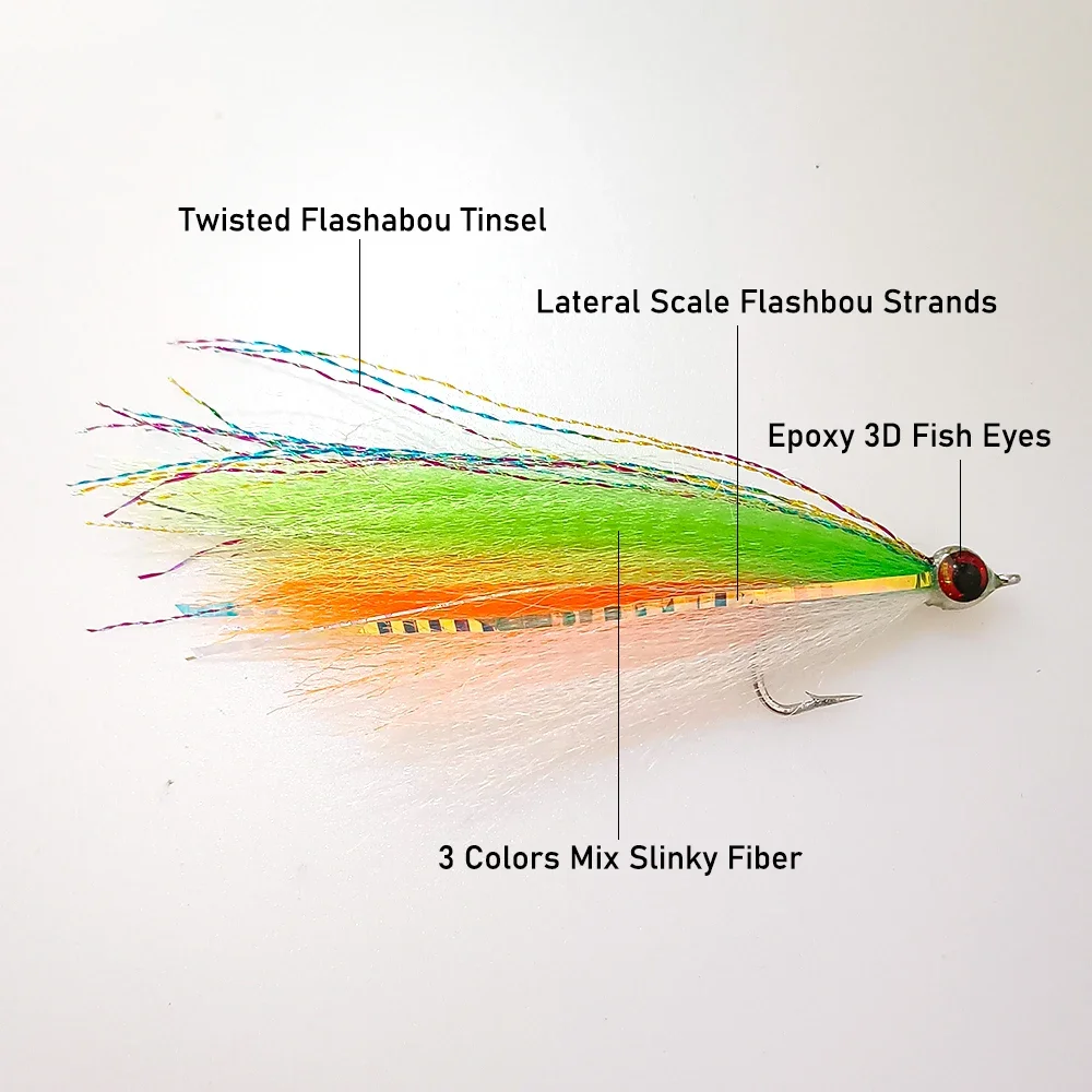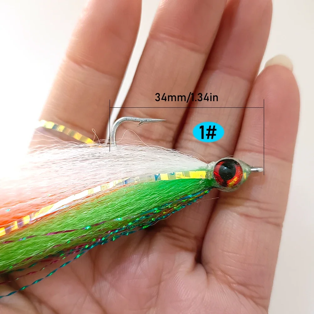 3D lifelike fishing eye makes flies more realistic and effectiveness,perfectly to drive fish wild and seduce different fish species.4 colors for optional,suitable for different water conditions.Meticulously hand tied streamer lures is made of slinky fiber,crystal flash tinsel and the strong and sharp hooks which offer stronger and deeper penetration.Great for Striped Bass,Redfish,Dorado,Snook,Trout,Pike fishing and more.