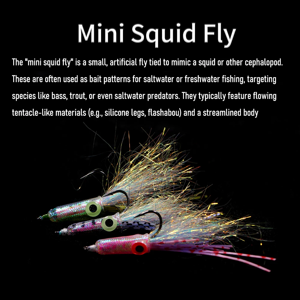 En la pesca con mosca, una "mapa de mini calamar" podría referirse a una pequeña mosca artificial atada para imitar un calamar u otro cefalopié.A menudo se utilizan como patrones de cebo para la pesca en agua salada o dulce, dirigidos a especies como lubina, trucha o incluso depredadores de agua salada.Por lo general, cuentan con materiales fluidos similares a tentáculos (por ejemplo, patas de silicona, flashabou) y un cuerpo aerodinámico.¡Su movimiento realista y su destello los hacen irresistibles para los peces depredadores!