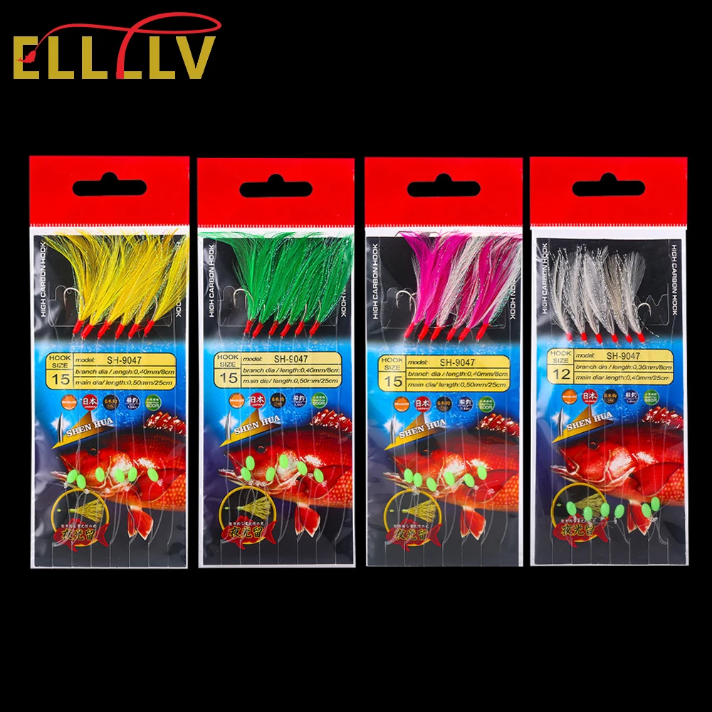 Ellllv 6 unids/bolsa 15 # anzuelos de cuerda pluma colorida Sabiki Rigs Pesca de agua salada señuelos artificiales cebo de mar caballa aparejos de Pesca