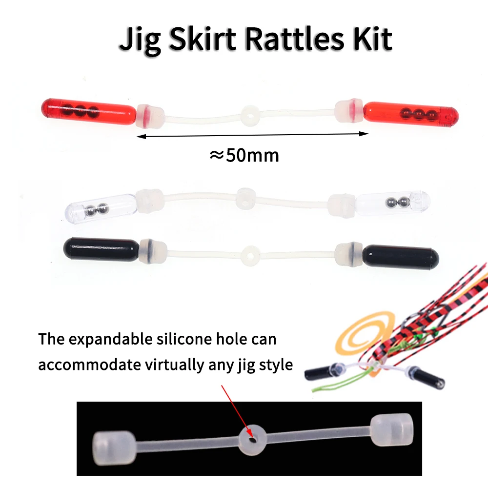 Los sonajeros Jig cuentan con un collar de goma con dos brazos flexibles con soportes de sonajeros y dos sonajeros con cajas de plástico duro con bolas de acero. Los sonajeros de plantilla se pueden agregar fácilmente a una plantilla simplemente deslizando el collar sobre un gancho y deslizándolo contra el cuello de la falda. Muchos pescadores prefieren pescar jigs con sonajeros, ya que realmente ayudan a la lubina a colocar un señuelo, especialmente cuando se usa en una cubierta pesada, agua sucia o pesca nocturna. Los brazos flexibles de estos sonajeros Jig ondulan alrededor con el más mínimo movimiento de la plantilla produciendo ruido que atrae a los peces.