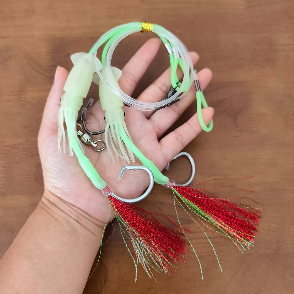 -Eficiente aparejo de pargo profundo con 2 anzuelos circulares y señuelo de pulpo suave y brillante, perfecto para apuntar a peces de azulejos, cultivos, pargos rojos, atún, tiburones, etc.