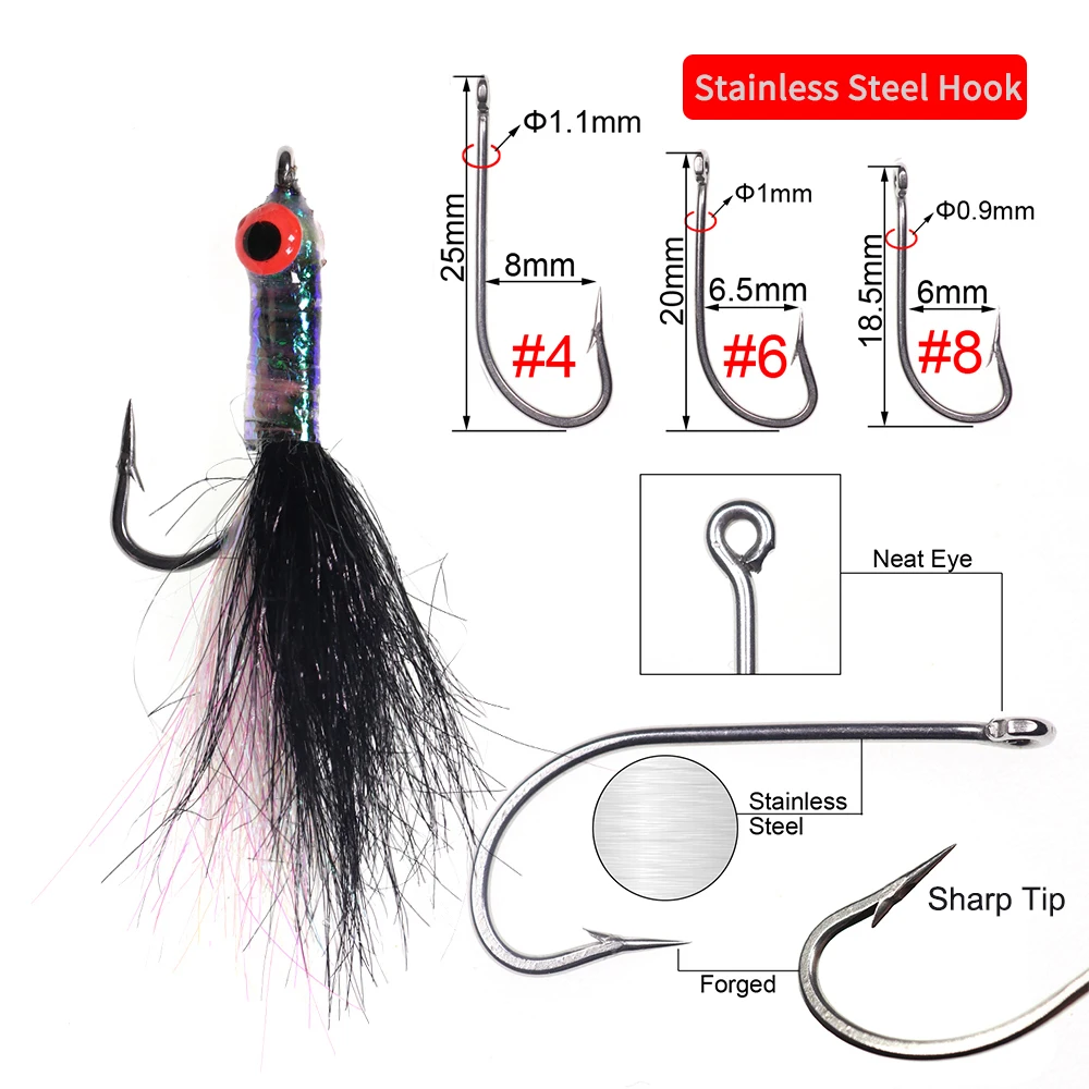 -Moscas atadas con gancho de acero inoxidable, aptas tanto para agua salada como dulce.