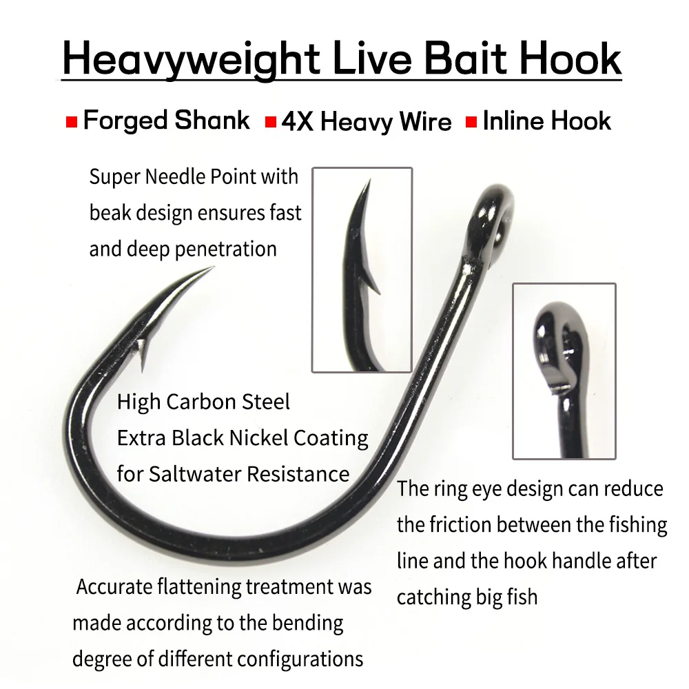 Aplicación: Anzuelo de cebo vivo ideal para pesca en agua salada/barco, anzuelo de juego grande para vivero de centavos de tiburón de atún, etc. También es un potente anzuelo de plantilla único.