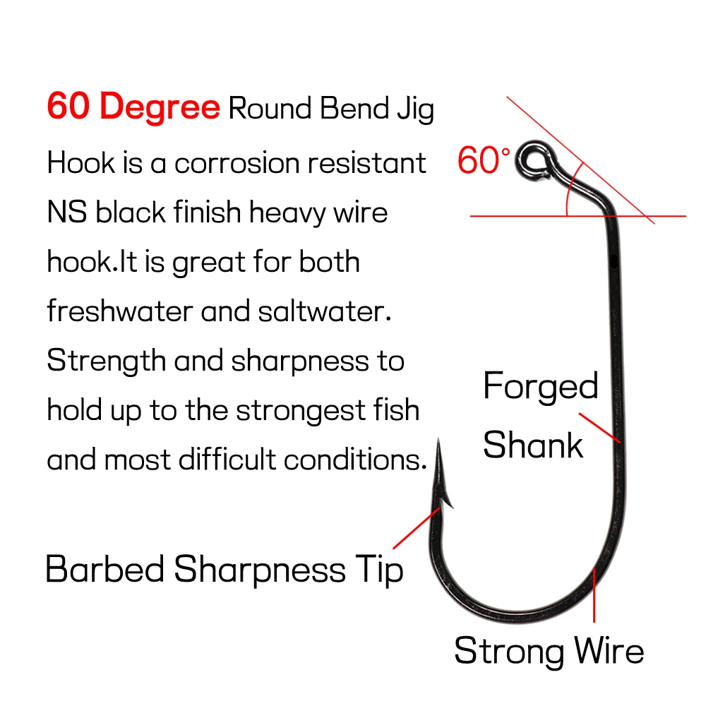 El gancho de plantilla de curva redonda de 60 grados es un gancho de alambre pesado de acabado negro NS resistente a la corrosión para uso en agua dulce o salada. Fuerza y nitidez para soportar los peces más fuertes y las condiciones más difíciles.