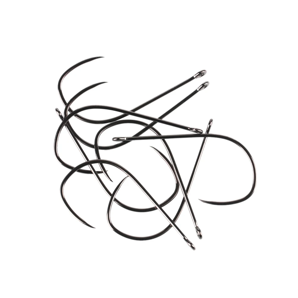 Características: acero con alto contenido de carbono, acabado en níquel negro, vástago largo 2X, sin púas, punto en línea, ojo recto, resistencia 2X, espacio amplio 1X, ultra afilado, forjado