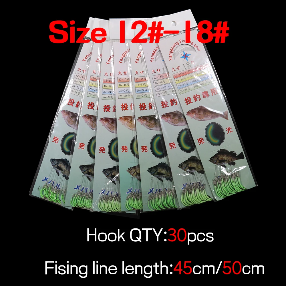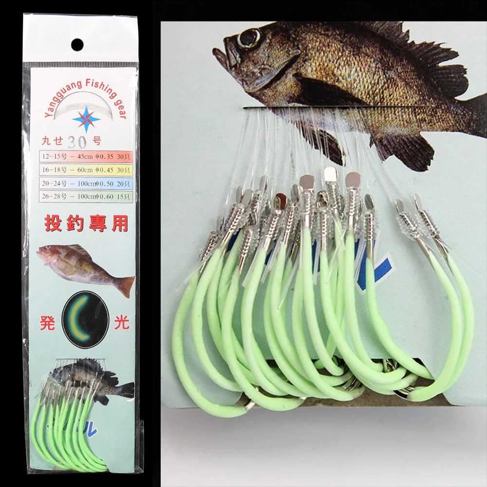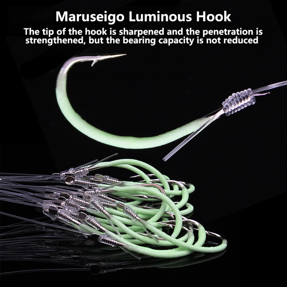 -30# Anzuelo de pesca luminoso con línea atada a mano, anzuelos de agua salada con púas brillantes para pesca de sobremesa