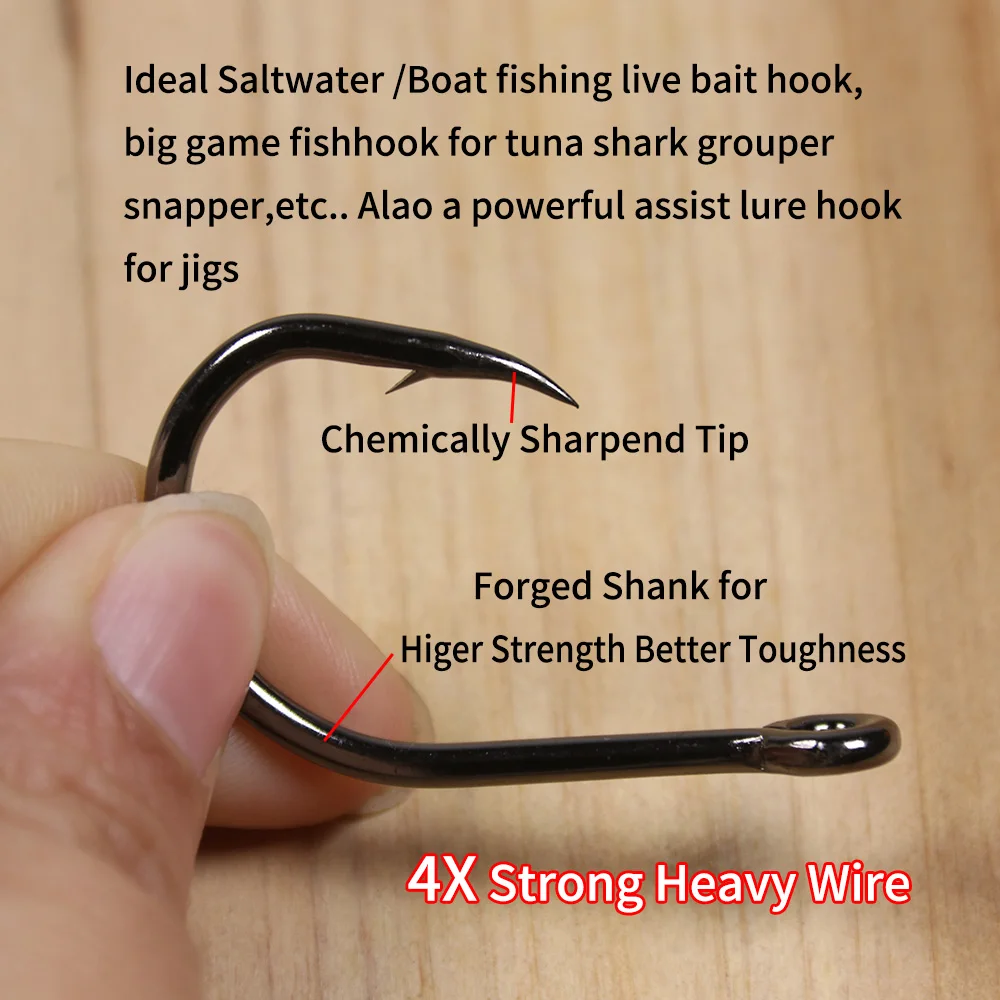 Aplicación: anzuelo de cebo vivo ideal para pesca en agua salada/Barco, anzuelo de caza mayor para pargo mero de tiburón atún, etc. También un potente gancho de plantilla único.