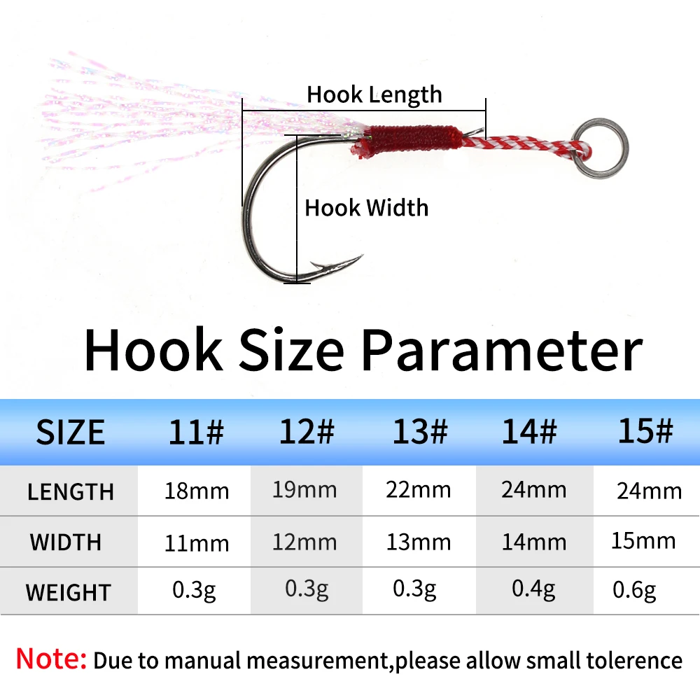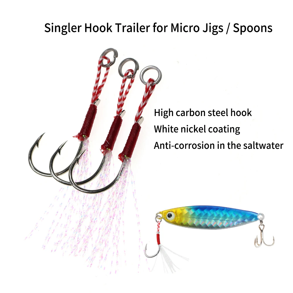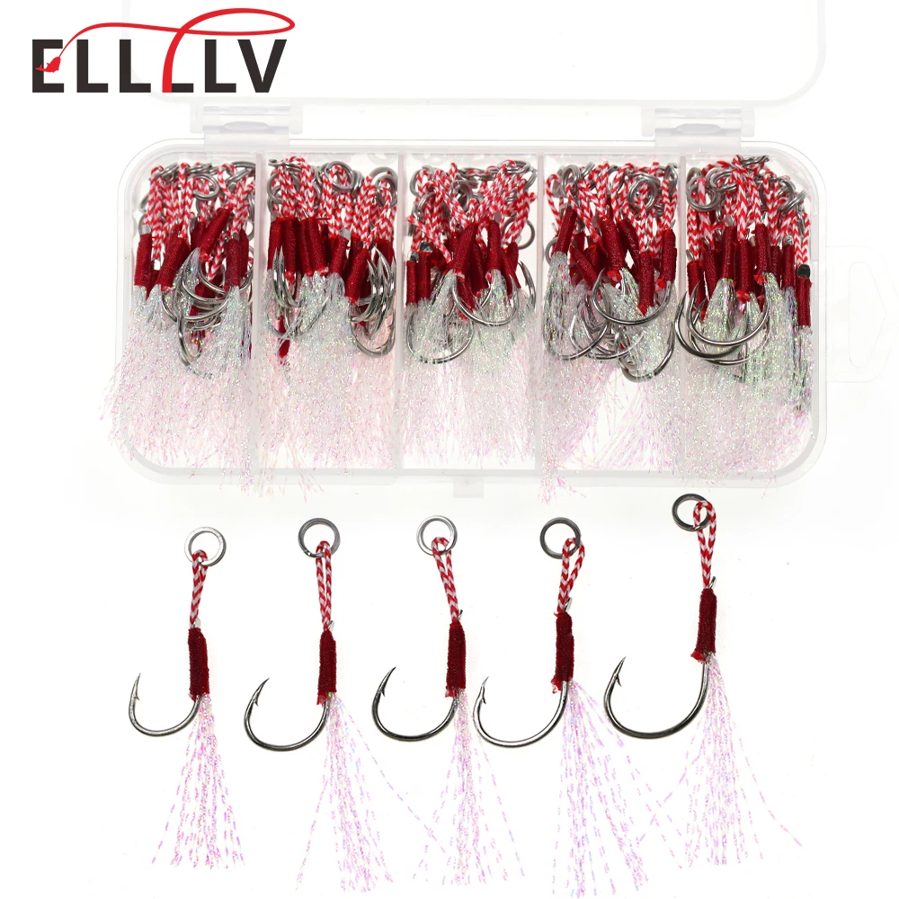 Elllv 100 unids/caja anzuelo de asistencia de jigging lento anzuelos de plantilla de fundición de púas individuales con anzuelos de señuelo de pesca de lubina de pluma 5 tamaños mixtos
