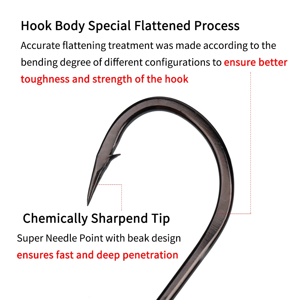 Características: Alambre pesado 4X, Ojo de anillo recto, vástago forjado, punta de aguja opti-ángulo, Punta compensada. Ganchos de acero de alto carbono de grado superior, recubrimiento adicional para resistente al agua salada, afilado químicamente y pulido por trabajadores experimentados. Proceso de aplanamiento especial del cuerpo del gancho, se realizó un tratamiento de aplanamiento preciso de acuerdo con el grado de flexión de las diferentes configuraciones para garantizar una mejor tenacidad y resistencia del gancho