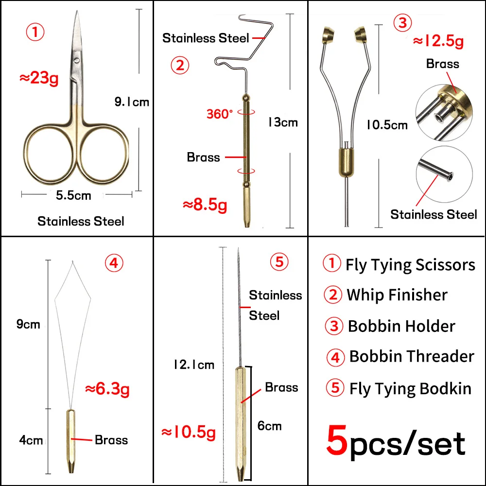 5pcs fly tying tool set (including thread scissors 1pc + bobbin holder 1pc +whip finisher 1pcs + bobbin threader 1pc + fly tying bodkin 1pc)