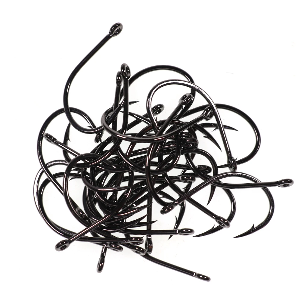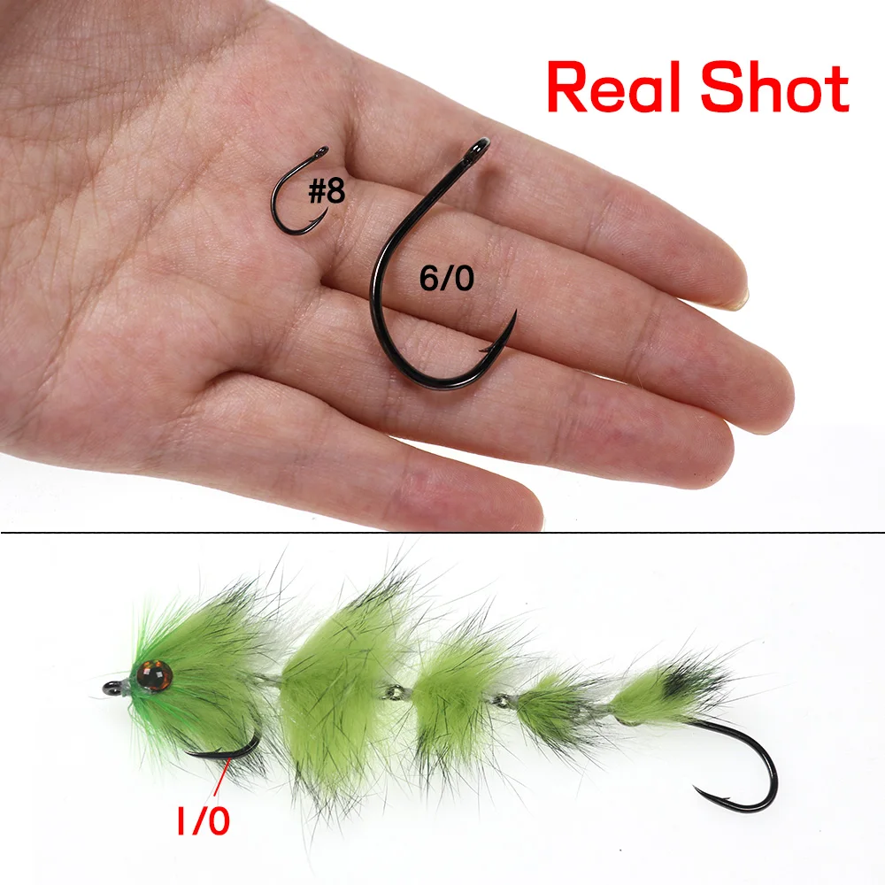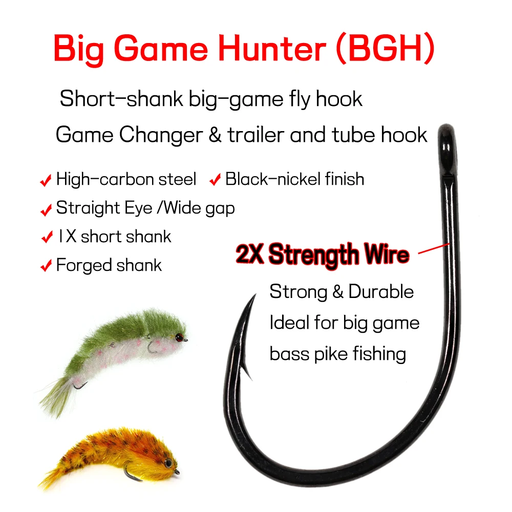Especificaciones: Mosca de caza mayor de vástago corto, cambiador de juego, remolque y ganchos de tubo; acabado negro-níquel, púas, ojo recto, 1X corto, 2X fuerza, espacio ancho, ultra afilado, acero de alto carbono, forjado.