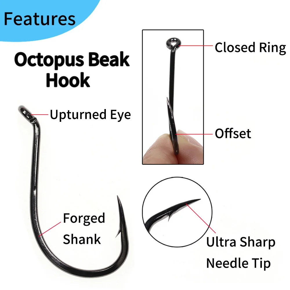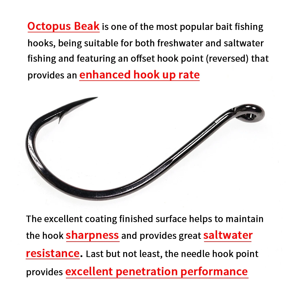 -Octopus Beak es uno de los anzuelos de pesca de cebo más populares, siendo adecuado tanto para la pesca en agua dulce como en agua salada y con un punto de anzuelo compensado (invertido) que proporciona una tasa de enganche mejorada.