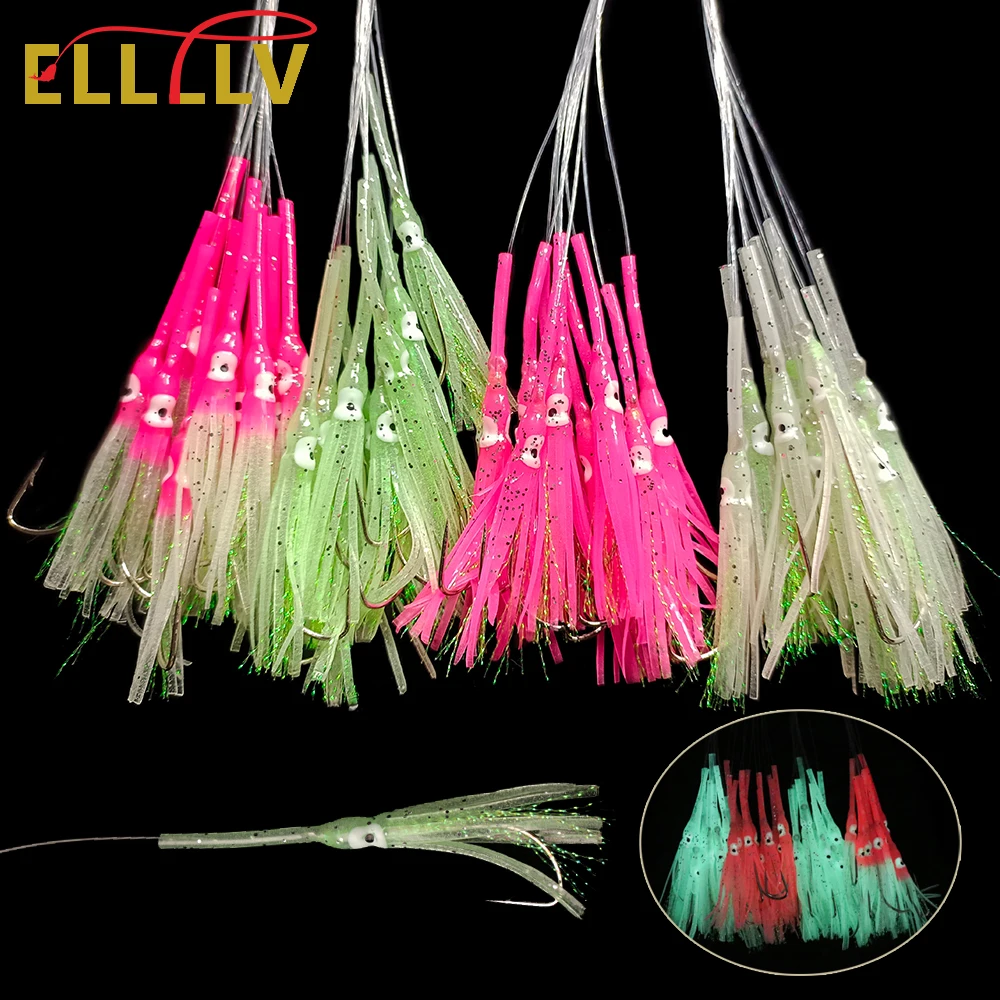 Elllv-Faldas de calamar luminosas antimordeduras con línea de monofilamento, señuelo de pesca de arenque, caballa de agua salada, 3/0,
