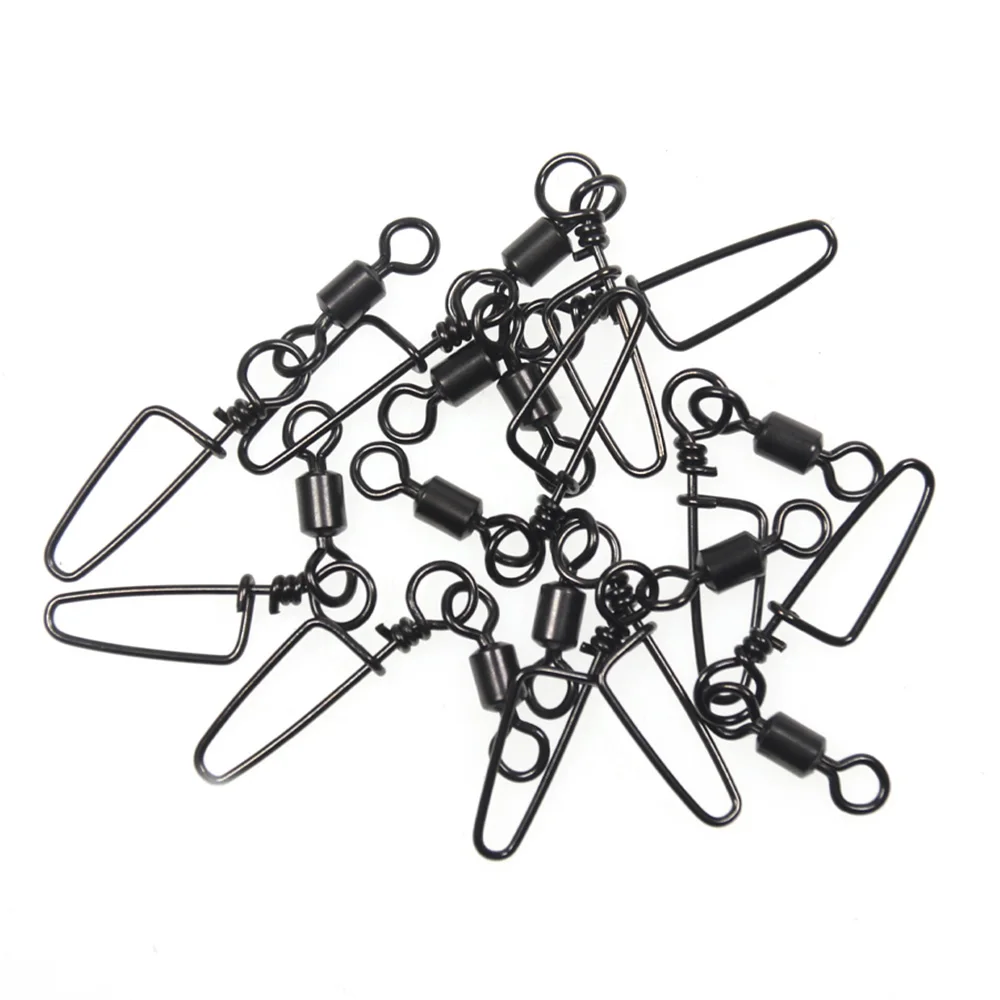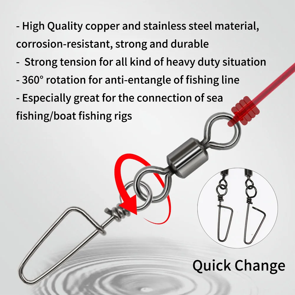 Alta calidad: Estos broches giratorios de pesca están hechos con cuerpo de cobre y broche de acero inoxidable. Acabado de níquel en todo el cuerpo del producto.