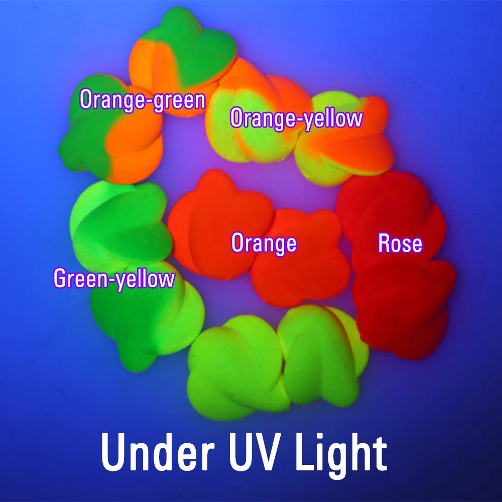 Color: Rosa, naranja, amarillo, verde-amarillo, naranja-amarillo, naranja-verde (con fluorescente bajo luz UV)
