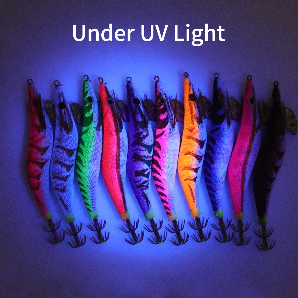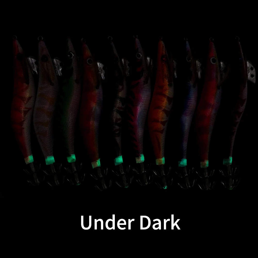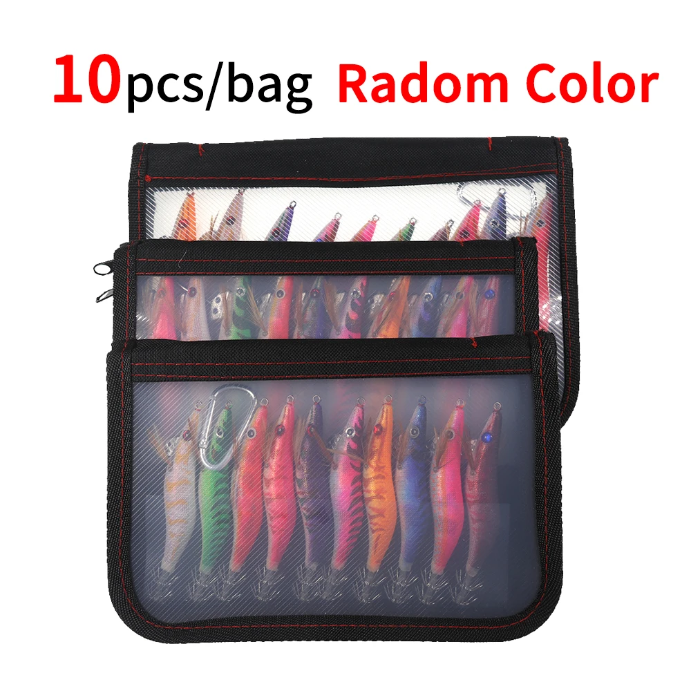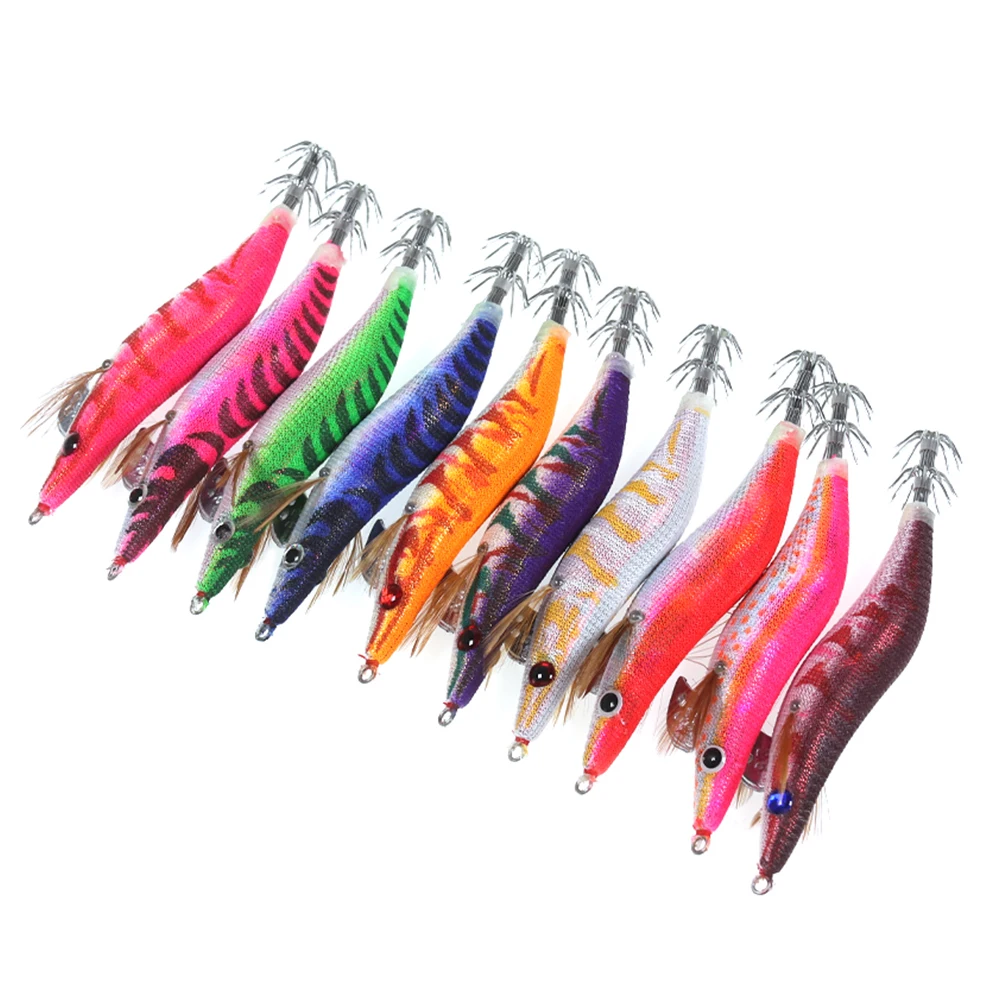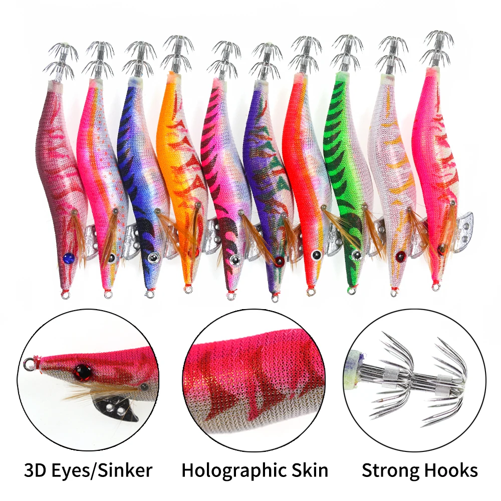 Elllv-Kit de señuelos de calamar para pesca de agua salada, anzuelo de doble capa para pescar, cebo holográfico de piel de madera para camarones, 10 uds.