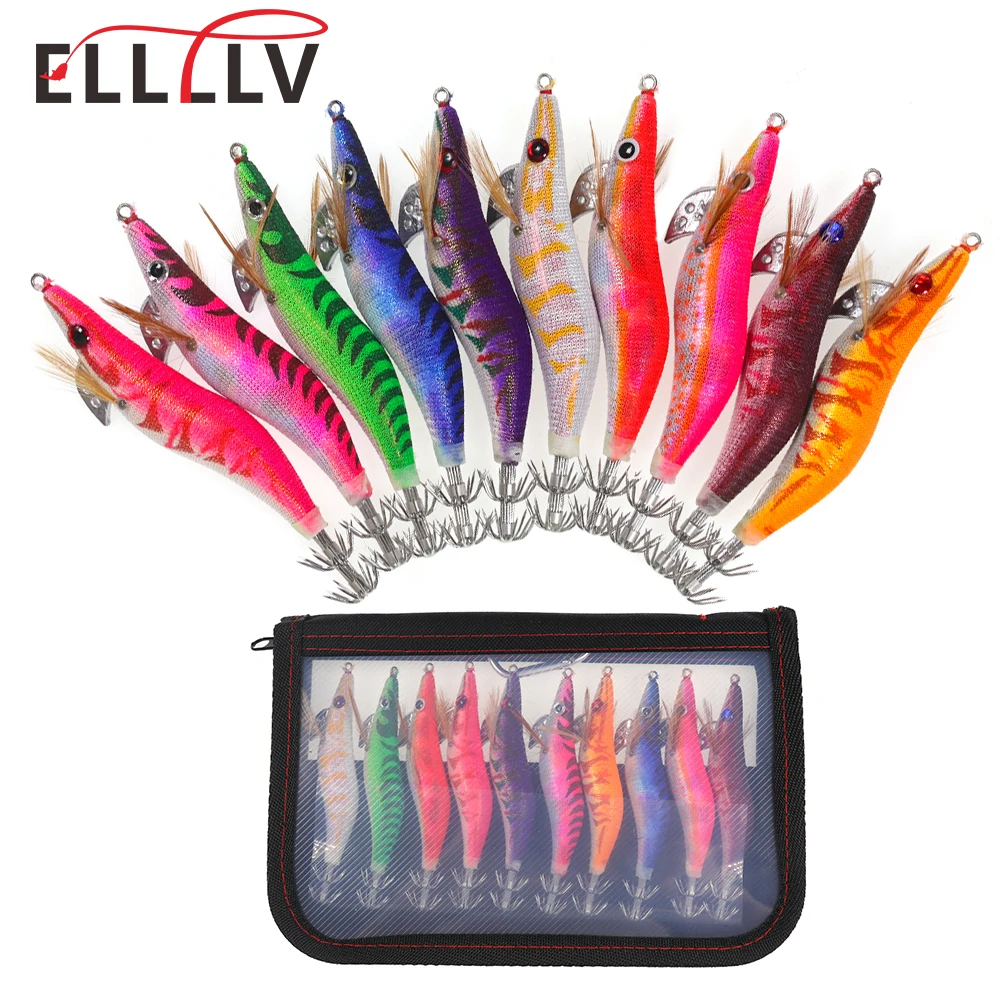Elllv-Kit de señuelos de calamar para pesca de agua salada, anzuelo de doble capa para pescar, cebo holográfico de piel de madera para camarones, 10 uds.