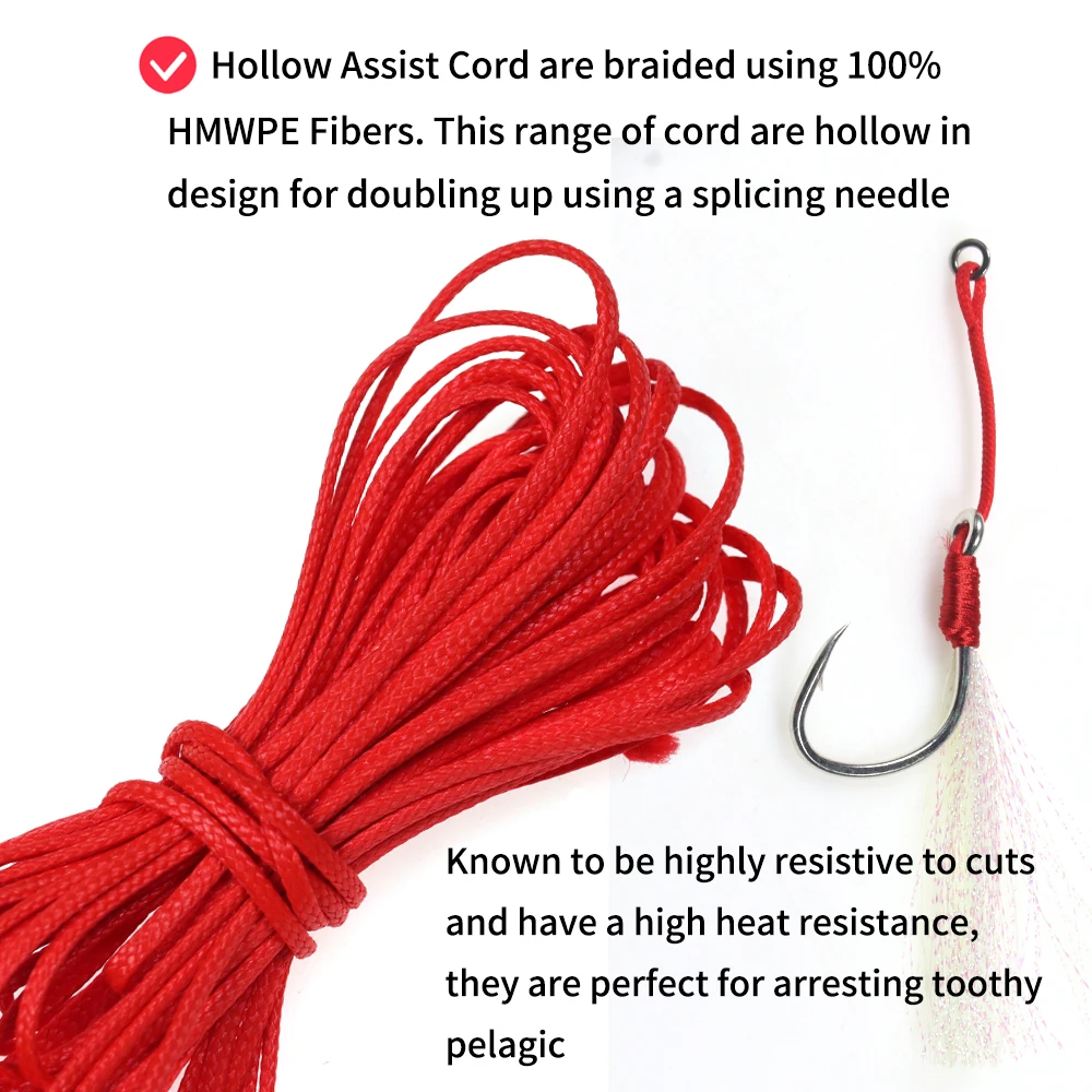 El Cordón de asistencia hueco está trenzado con fibras 100% HMWPE. Esta gama de cordón tiene un diseño hueco para doblar usando una aguja de empalme. Conocidos por ser altamente resistentes a los cortes y tener una alta resistencia al calor, son perfectos para detener pelágicos dentados.