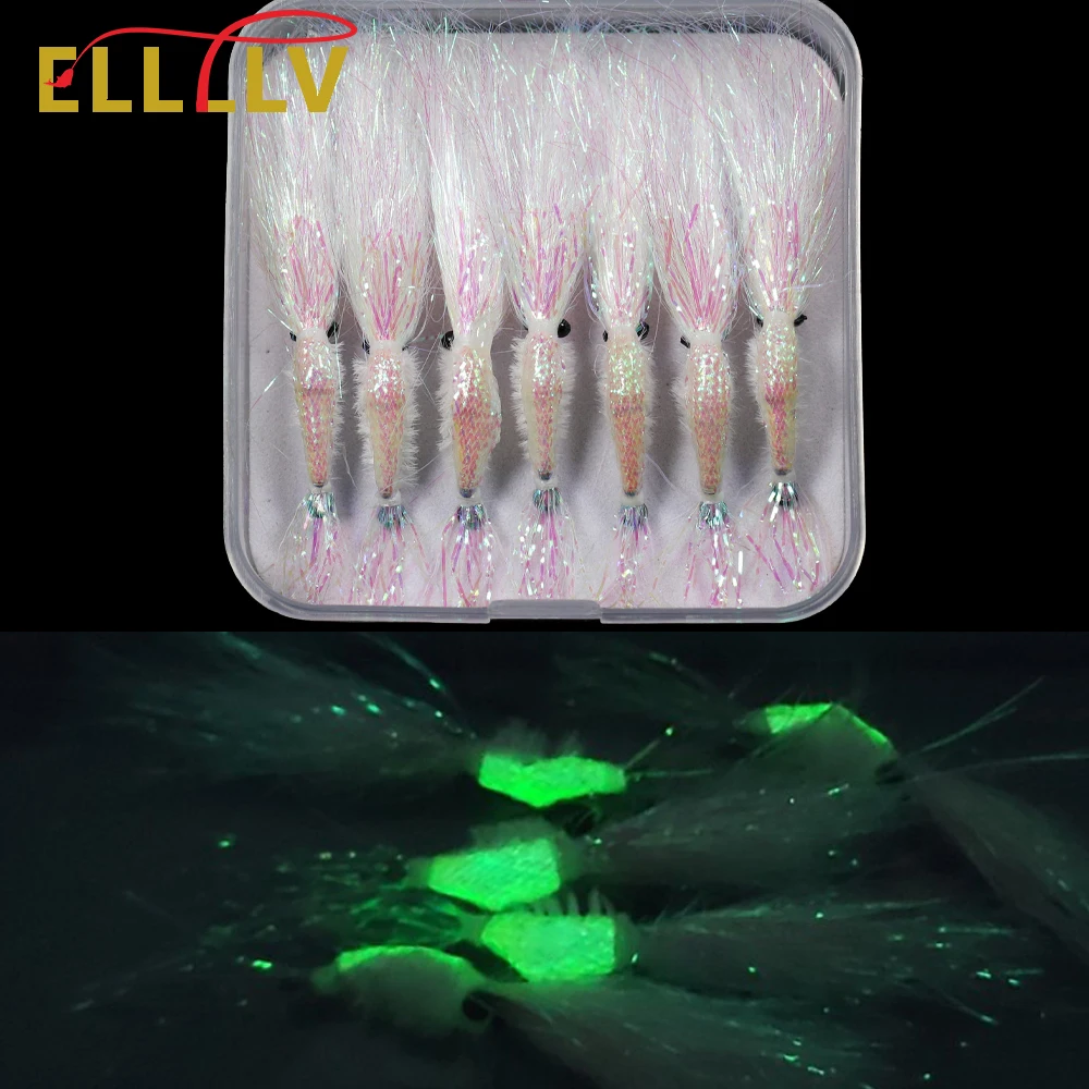Elllv 7 unids/caja #4 #6 #8 perla blanca hielo ala Camarón sal mosca luminosa agua salada agua dulce moscas lubina trucha salmón señuelo cebo