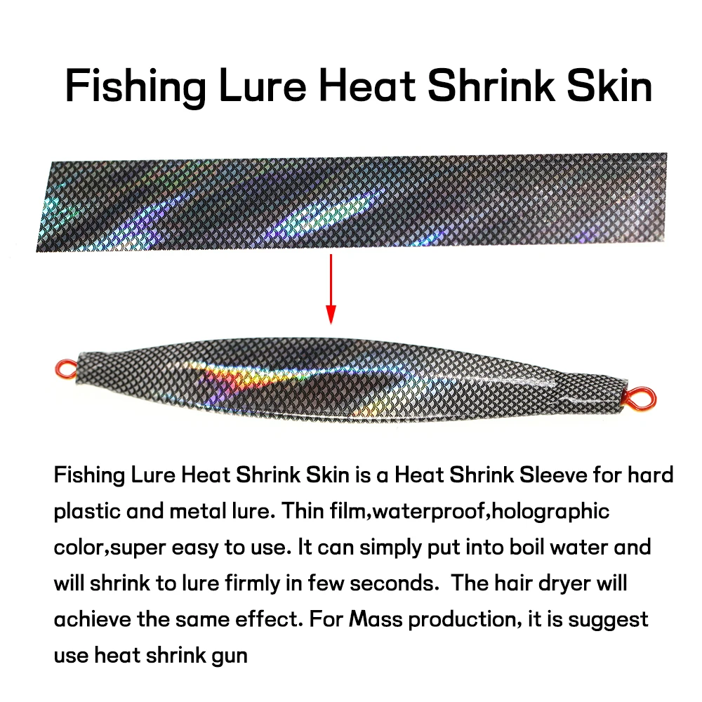La piel termorretráctil del señuelo de pesca es una funda termorretráctil para señuelos de plástico duro y metal. Película delgada, impermeable, color holográfico, súper fácil de usar. Simplemente se puede poner en agua hirviendo y se encogerá firmemente en el señuelo en pocos segundos. El secador de pelo logrará el mismo efecto. Para la producción en masa, se sugiere usar una pistola termorretráctil