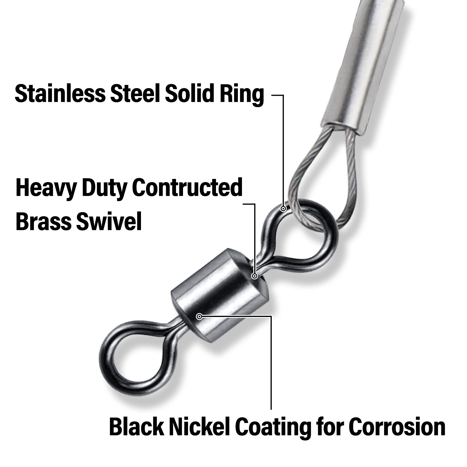 Barril giratorio: Equipado con un cilindro giratorio de alta resistencia y un anillo sólido, diseñado para una rotación suave, fricción reducida y conexión estable en la pesca líder de acero.
