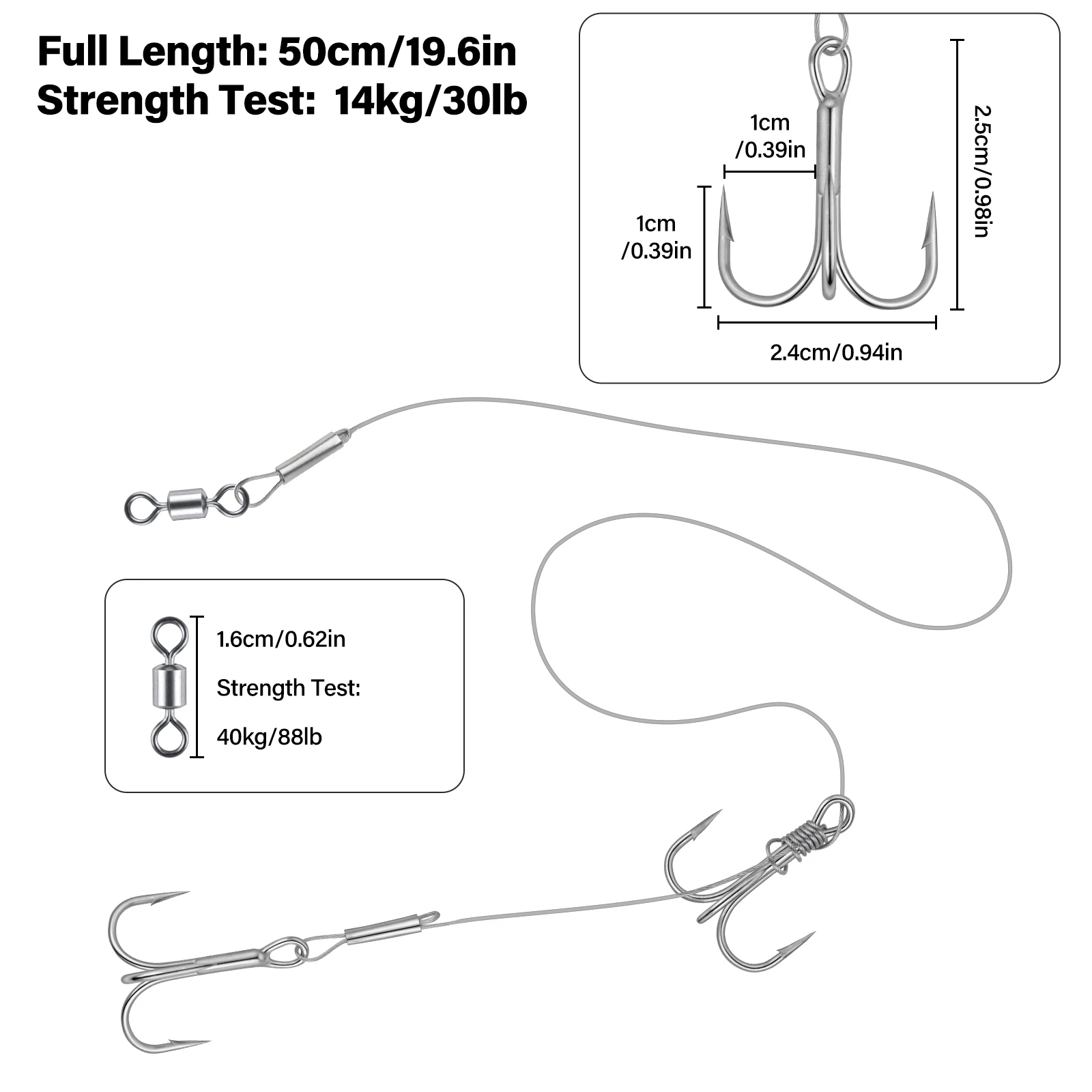 Detalles de la plataforma: longitud del líder: 50 cm/19,6"; Tamaño del giro: # 3 (1,5 cm/0,6", 40 kg/88 lb); Tamaño del gancho: # 2 agudos (25 mm/0,98" de largo, 23 mm/0,9" de ancho); El paquete incluye 2 aparejos completos para anzuelos de pesca líderes.