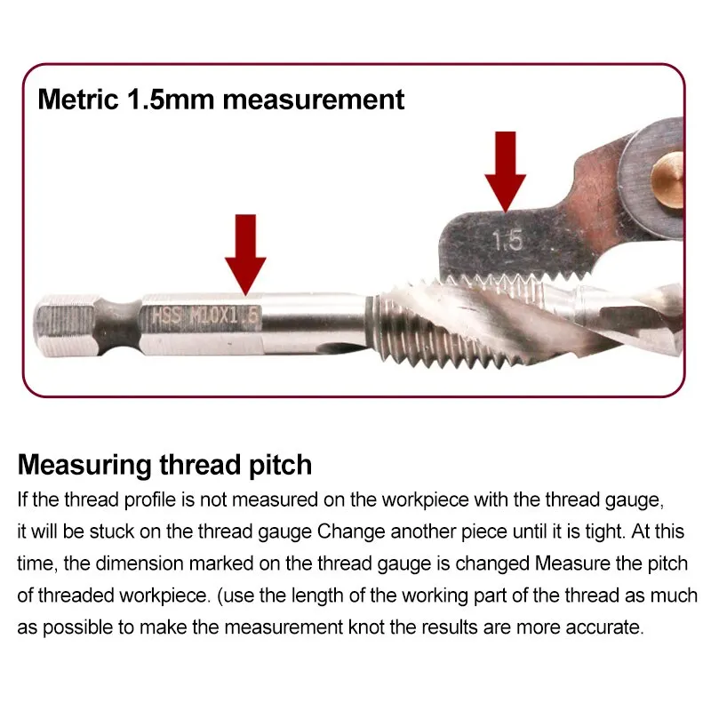 -El hilo métrico también se conoce como hilo métrico internacional. El hilo métrico tiene hilo ordinario (ángulo de diente 60 °); Hilo trapezoidal (ángulo de perfil 30 °); Hilo dentado (ángulo de perfil 33 °); Hilo cuadrado, etc.(Este producto es adecuado para hilo ordinario de 60 grados)