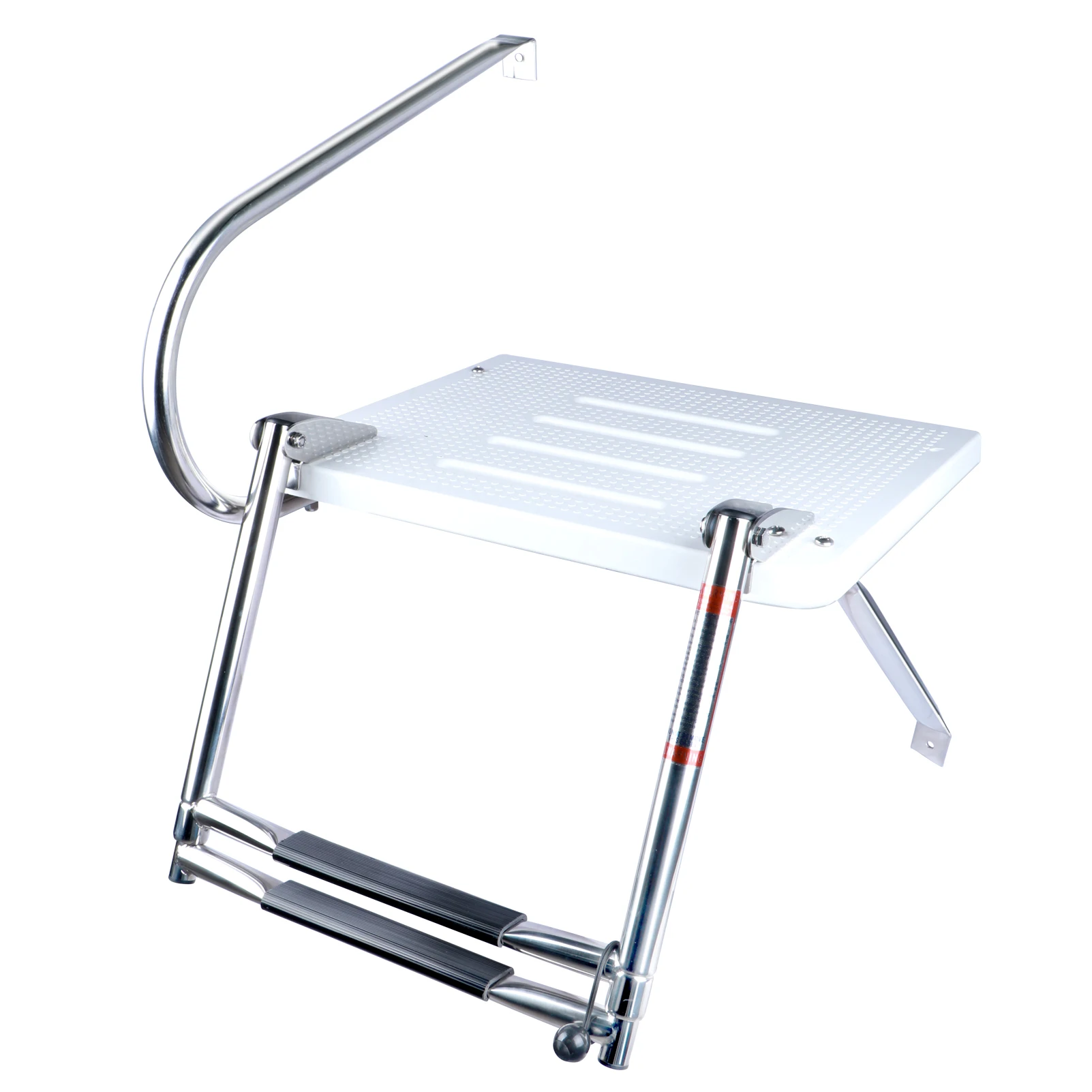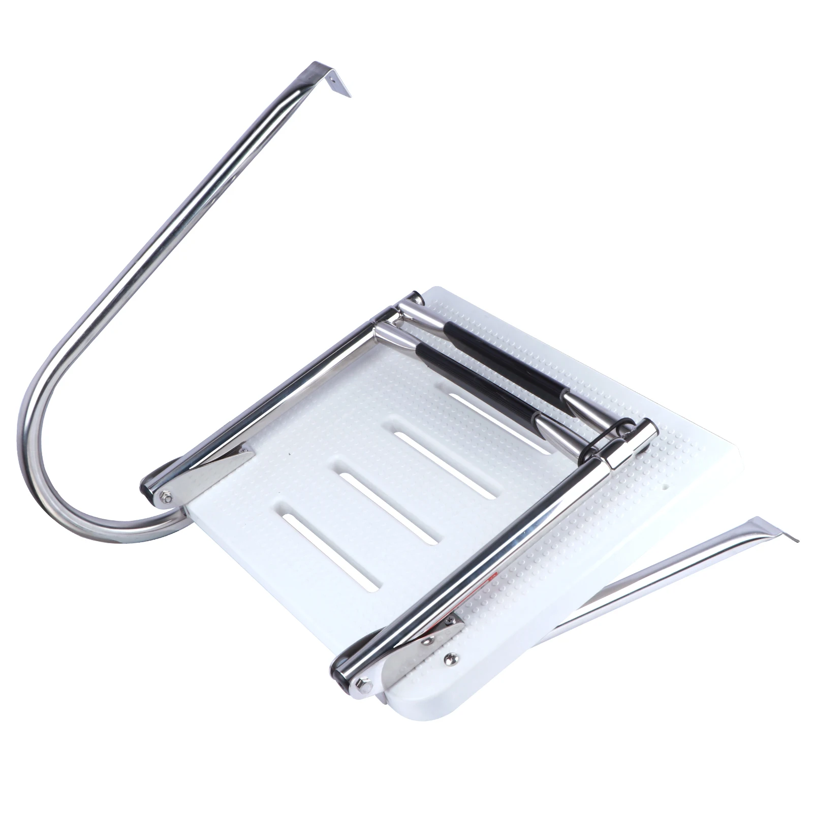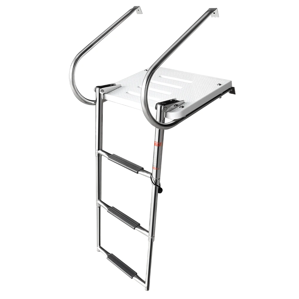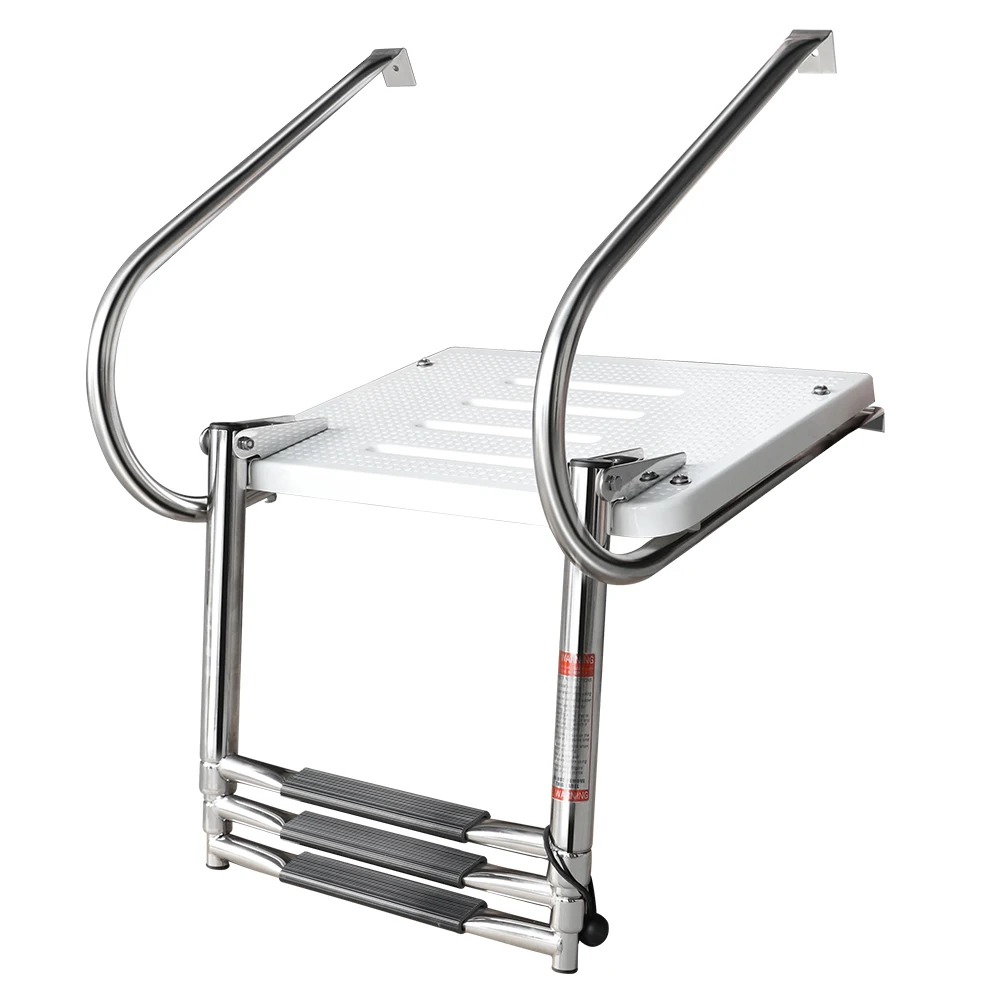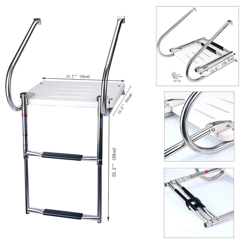 ▲ Specification Step Thread: 7.25" X 1.5", Thickness of Tube: 7/8" Platform: 14" (Length) X 18" (Width), Length Deployed: 23" (Length) X 13 1/4" (Width), Length Stowed: 13 1/2" (Length) X 13 1/4" (Width) Ladder can be stowed for storage purpose. White Platform is made of Fiberglass Black Step Threads on steps for safety purpose. High-Strength Stainless Steel 304 Tubing at 7/8". Hardware included for both inboard and outboard applications, Easy to install, Velcro Strap included to stow ladder. Weight Capacity: 275 lb.