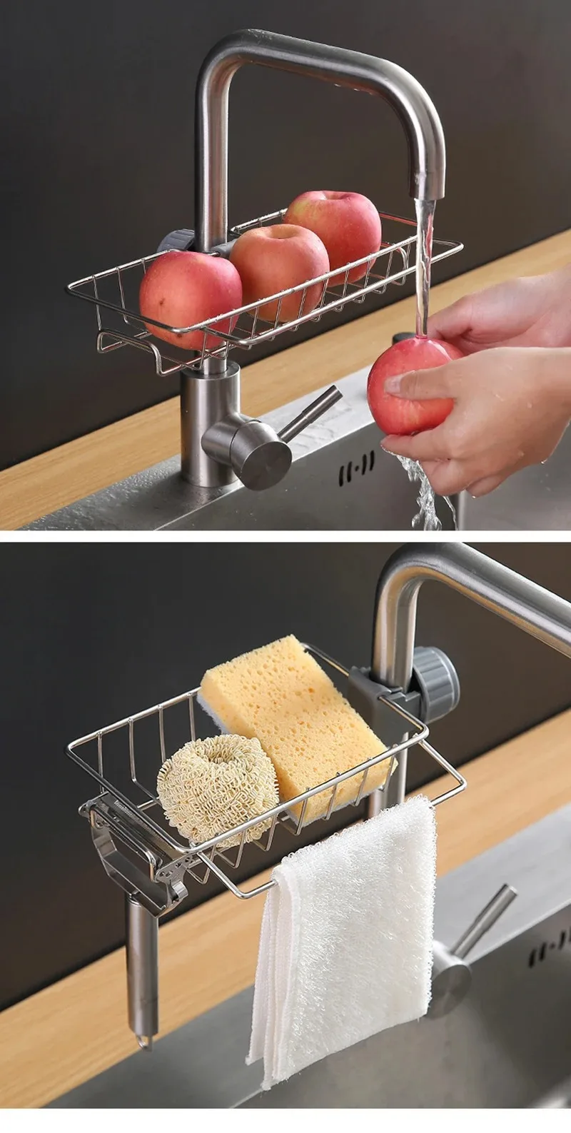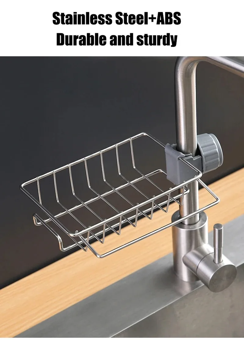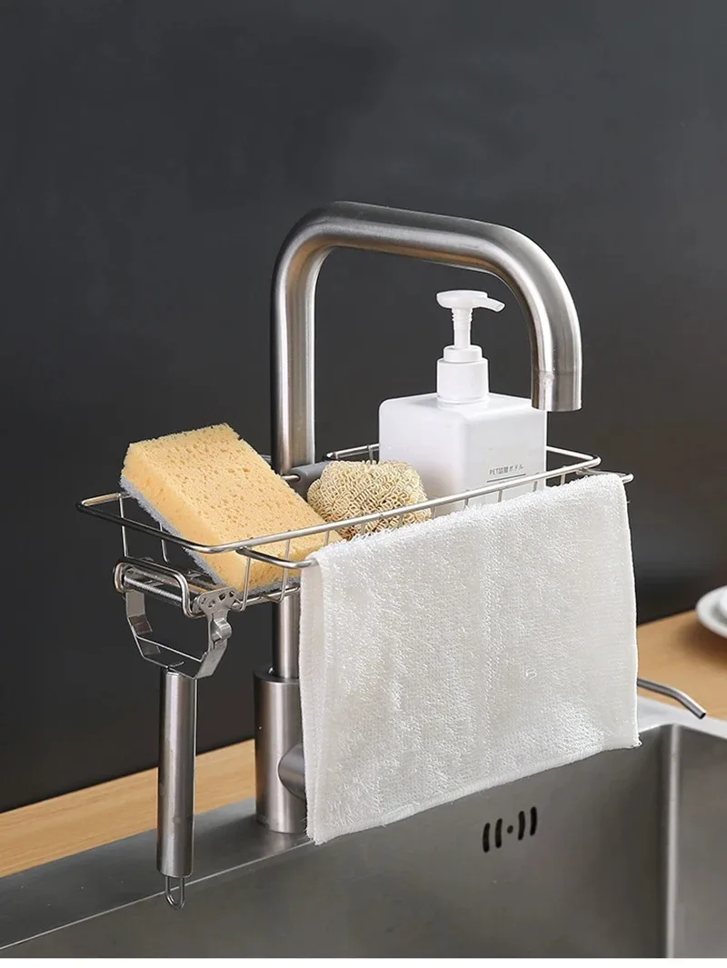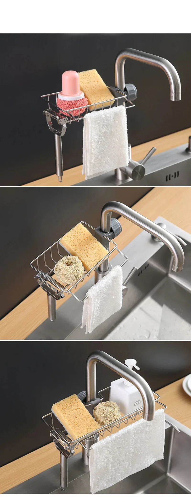 Escurridor de fregadero de acero inoxidable, estante de pared para fregadero, almacenamiento de esponja, estante de tela
