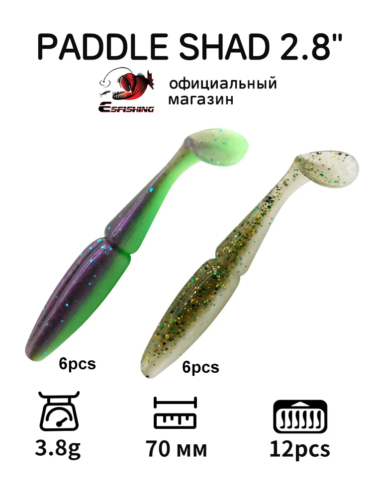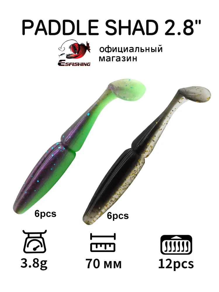 ESFISHING-señuelo de pesca con cebo de silicona, cola de paleta, fácil, 7cm, 12 Uds., swimbait para Lucio, trucha y lubina