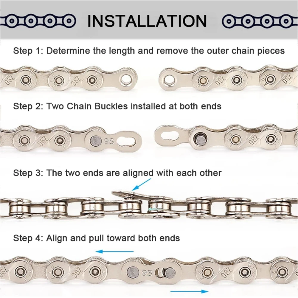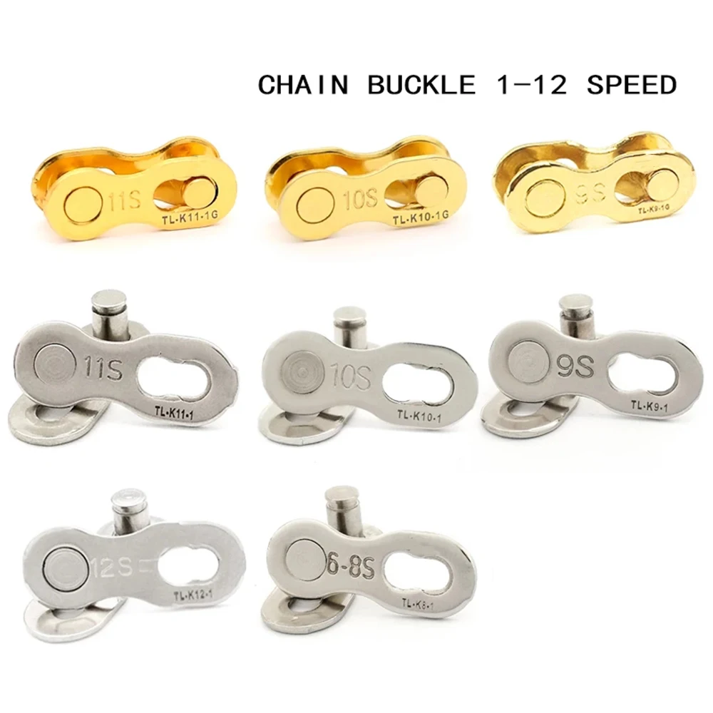 Material: 50# Steel Color: Silver/Gold Suit for: 6/7/8/9/10/11/12 speed bicycle chain (optional) Quantity: 5pair=10pcs Package include: 5pair bicycle chain links Features 1. Easy to install Chain joints for the magic buckle, easy to assemble and disassemble, easy to clean, can be reused about 5 times, suitable for mountain bike and road bike 2. Good Material Made of high quality steel, repeated forging, strict control of materials to ensure the strength, suitable for a long-term use 3. Smooth lubrication Surface polishing, internal oiling, better corrosion resistance and appearance. 4. Accurate matching Professional equipment test spacing, professional and technical test data, suitable for 1/6/7/8/9/10/11/12 speed bicycle chain. 5. Quantity 5 pairs of chain link, totally 10 pieces. Well packed in a bag, convenient to carry and avoid losing. Installation(Please refer to the picture) Step 1: Determine the leagth and remove the outer chain pieces Step 2: Two chain buckles installed at both ends Step 3: The two ends are aligned with each other Step 4: Align and pull toward both ends