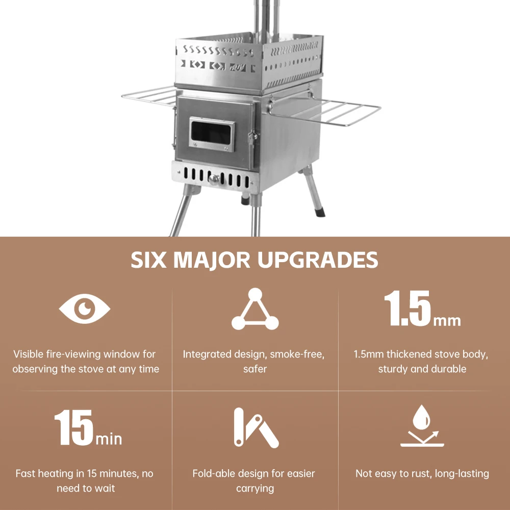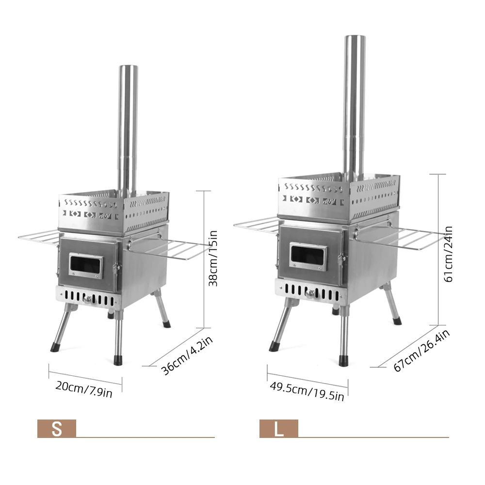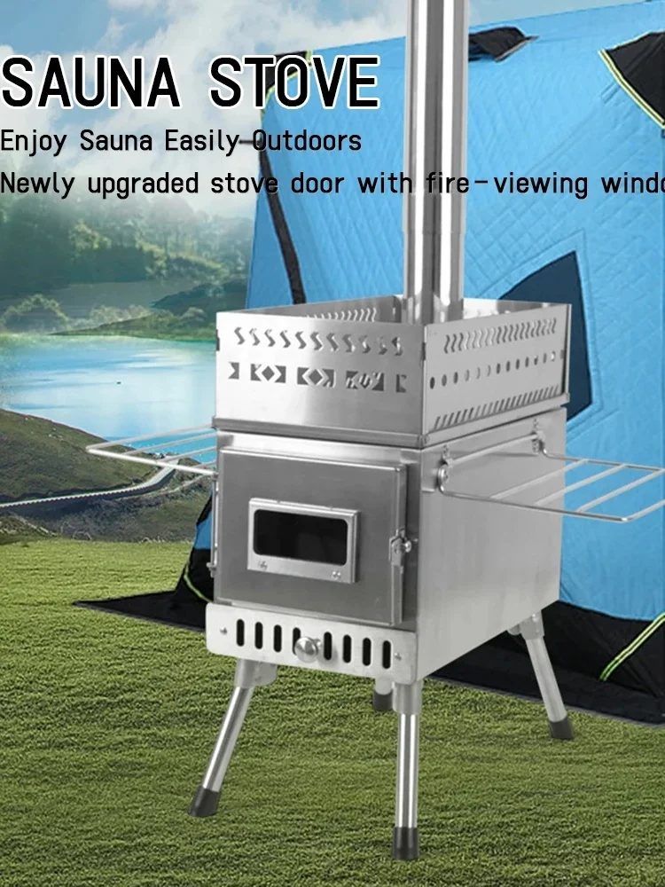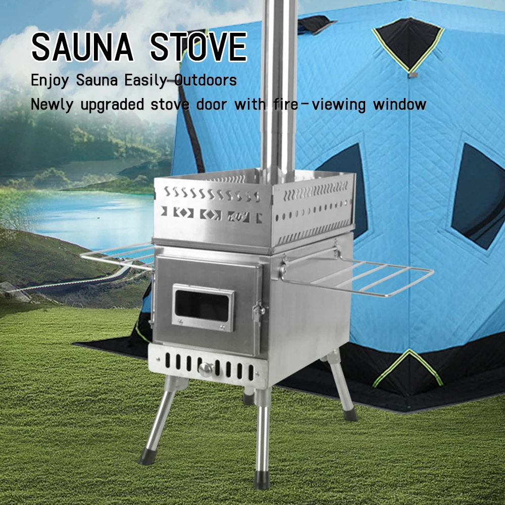Estufa de sauna de acero inoxidable, adecuada para tiendas de campaña al aire libre, leña para calefacción, plegable y portátil para uso doméstico, diseñada con una ventana, haciendo que la sauna sea fácilmente accesible al aire libre.