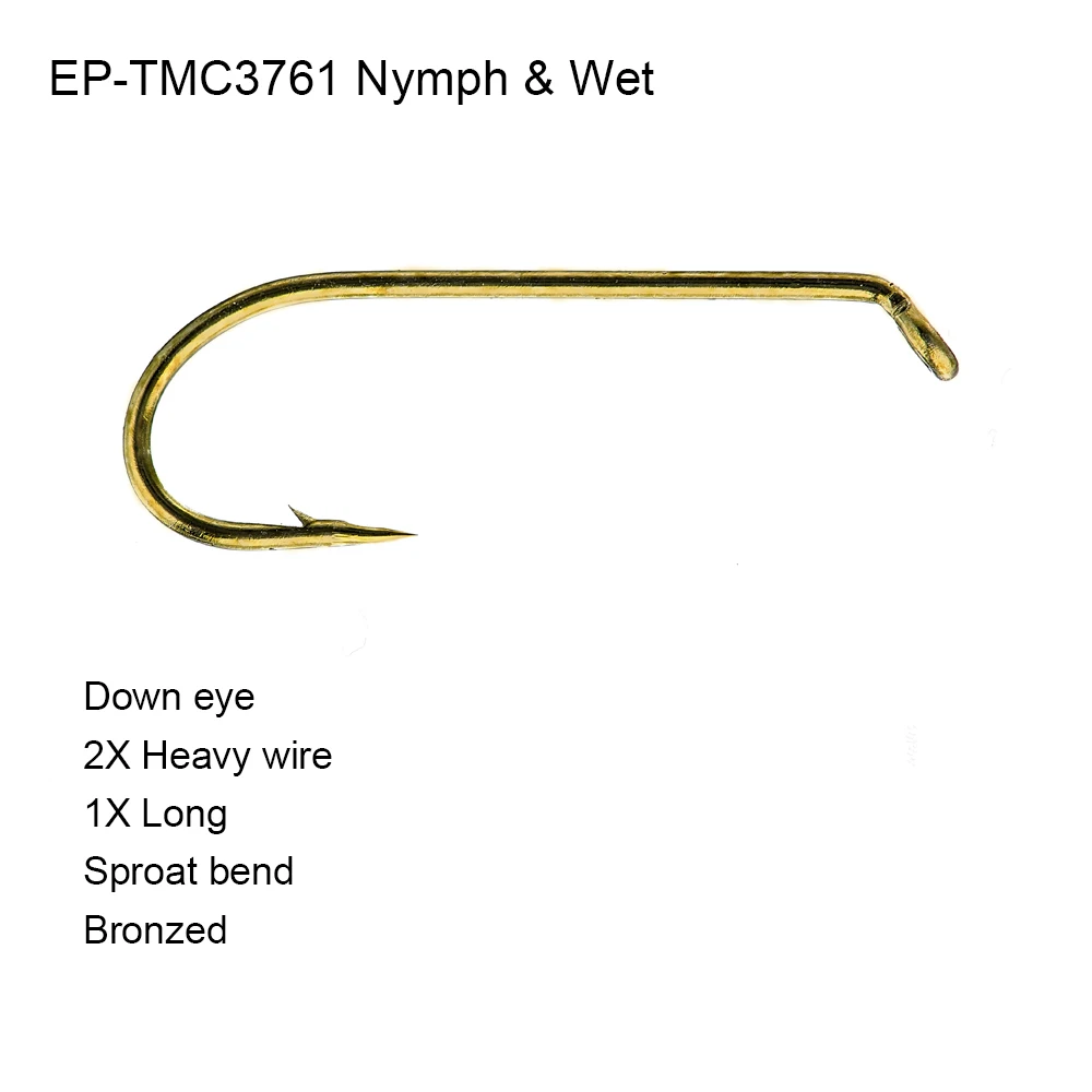 El gancho estándar dwon-eye para moscas húmedas y Ninfa, que el mismo diseño básico EP-TMC3769, pero este Gancho es 1X largo para atar patrones de Ninfa más extendidos y está disponible en un rango más amplio de tamaño, de tallas #2 a #20