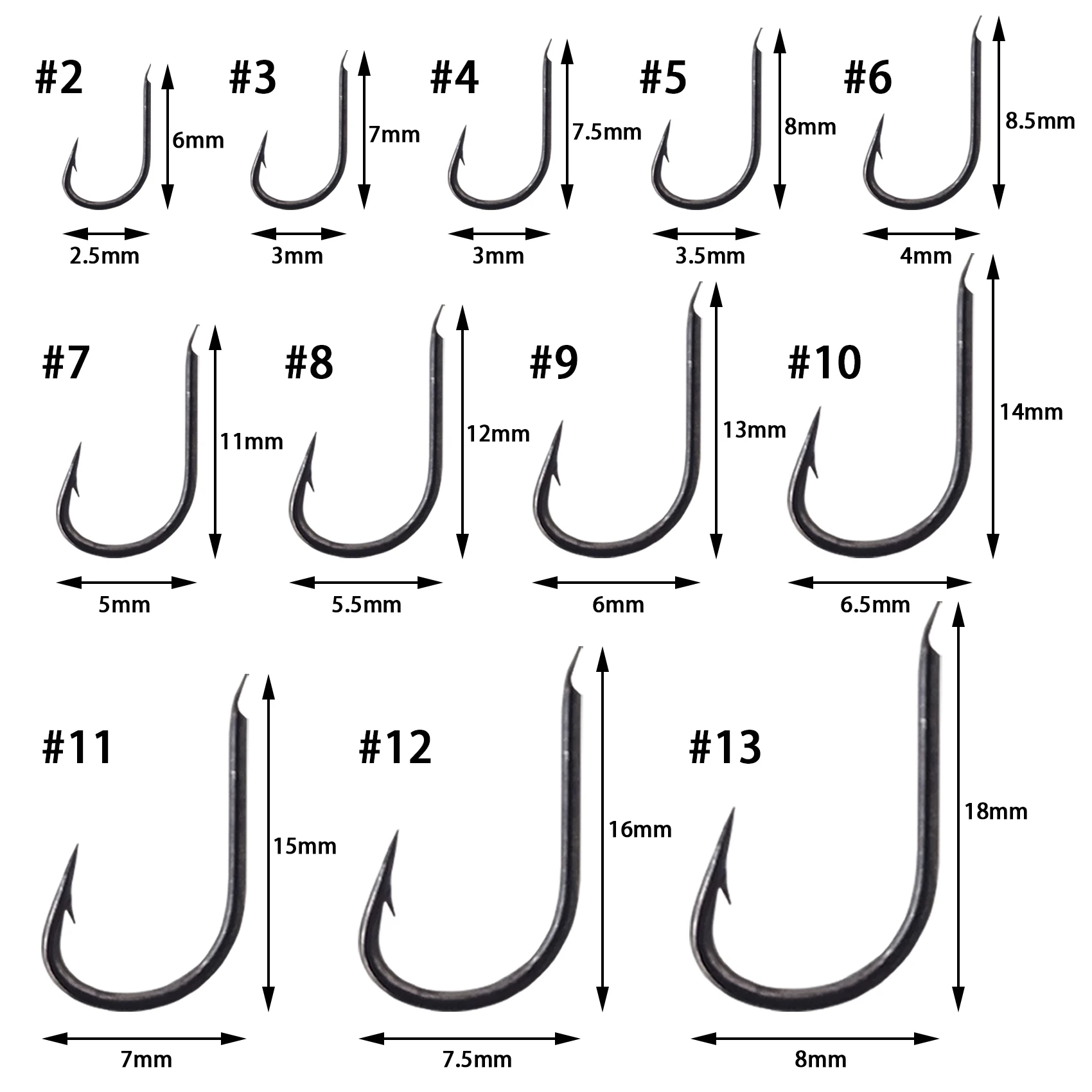 Múltiples tamaños: #2, #3, #4, #5, #6, #7, #8, #9, #10, #11, #12, #13, un total de 12 diferentes tamaños de anzuelos con 12 piezas cada uno, que satisfacen sus necesidades diarias para una variedad de tamaños, ¡asegurando el disfrute de la pesca!