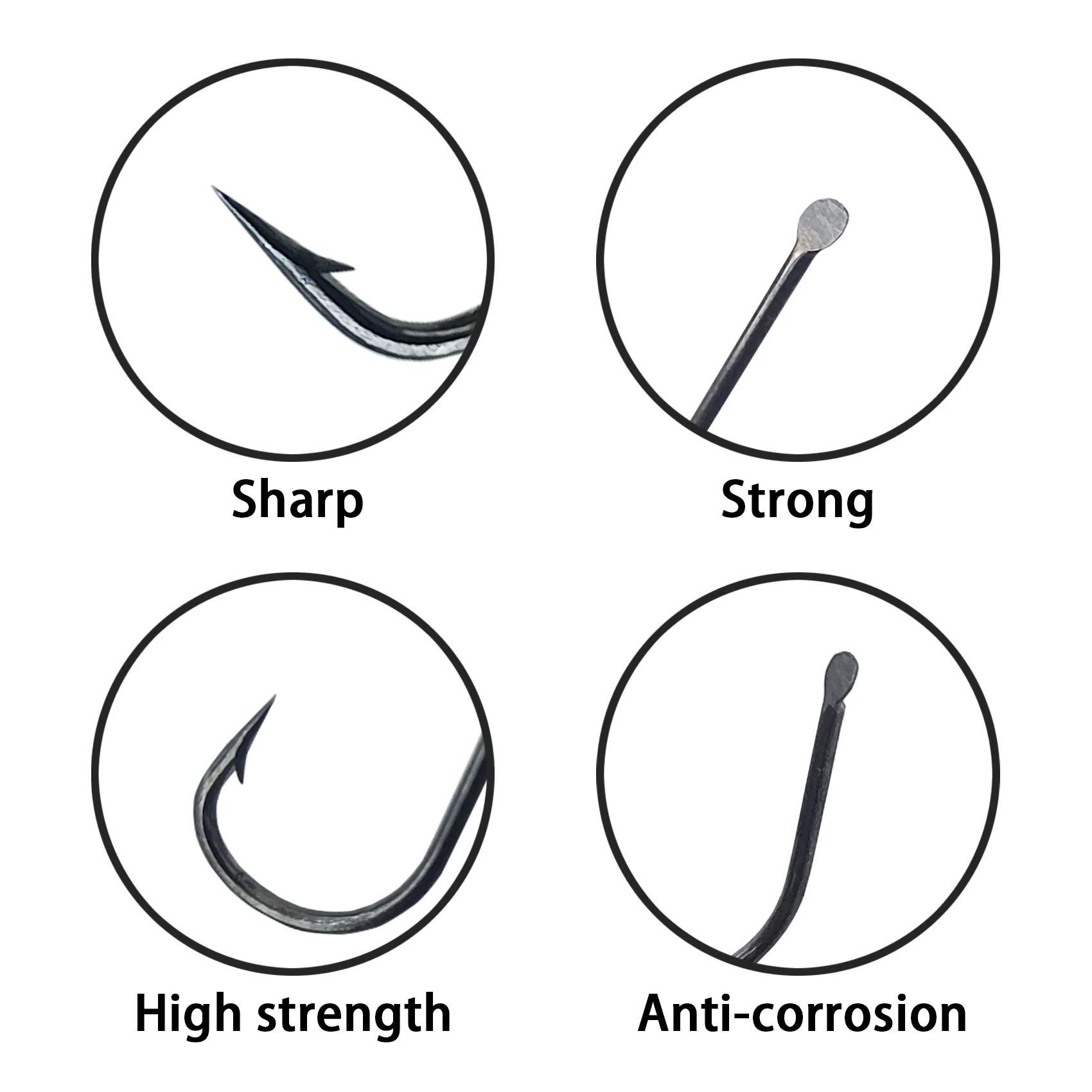 Material de alta calidad: los anzuelos están hechos de acero con alto contenido de carbono, con excelente calidad de material, alta resistencia, alta tenacidad y resistencia a la corrosión.
