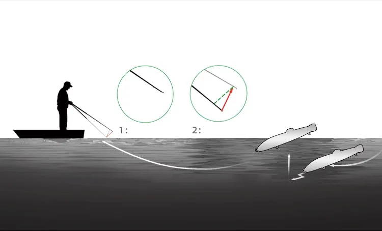 1. Apriete el hilo restante después de que el cebo caiga al agua. Después de que el cebo se hunda en la capa de agua objetivo, levante la línea a una velocidad constante con la punta del poste hacia abajo hasta que el cebo se retraiga y salga de la superficie del agua.