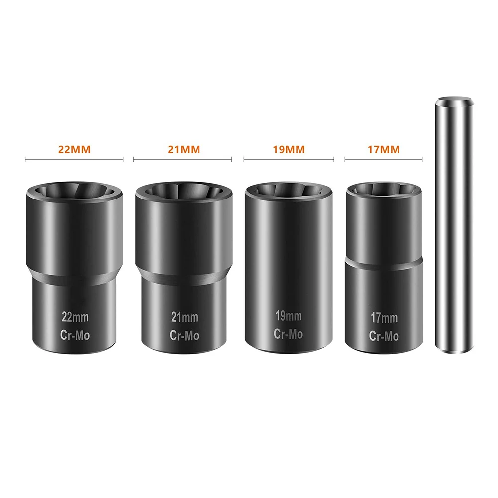 6.TAMAÑO PERFECTO PARA SU NECESIDAD: Estos extractores de tuercas con casquillo retorcido livianos incluyen casquillos de extracción de pernos y tuercas de 17 mm, 19 mm, 21 mm y 22 mm;El kit de extracción de tornillos pelados también incluye una barra de extracción de tuercas estampada por deriva de 12 mm que saca fácilmente la tuerca removida del casquillo de extracción.