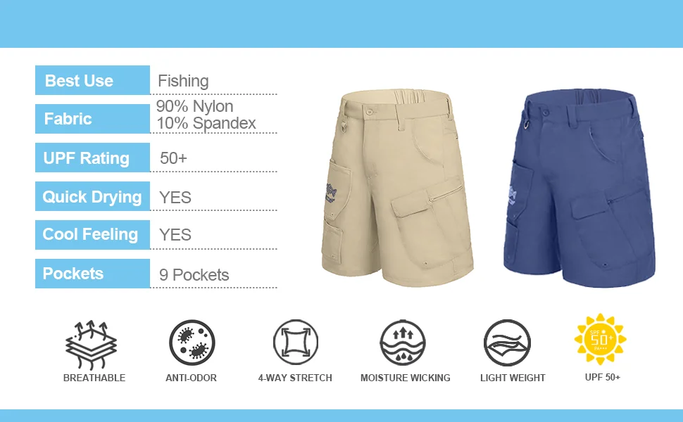CORTE DE PESCA DE RENDIMIENTO: Hecho de tela de nailon elástico 600D de alta densidad resistente al agua de primera calidad.Equipado con protección UV eficiente UPF 50+ para ayudarlo a disfrutar del sol sin quemarse por los dañinos rayos UVA y UVB.La tela de nuestros pantalones cortos de pesca de alto rendimiento ha sido tratada con un revestimiento repelente al agua.Se seca rápidamente: evita manchas y mantén limpio.Excelentes propiedades absorbentes para el manejo vital de la humedad y la reducción del olor del sudor.