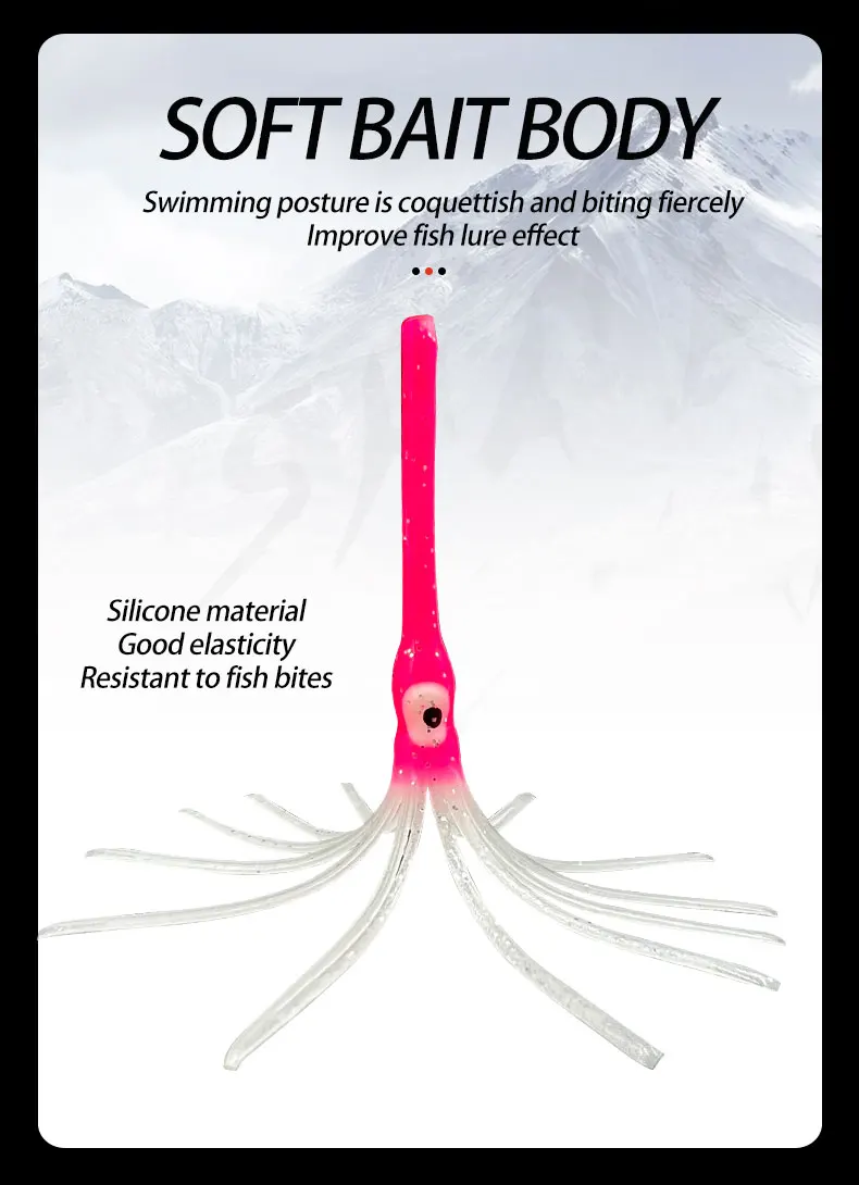 【Material】:El cebo de pesca con falda de calamar está hecho de caucho de alta calidad, suave y resistente, resistente al desgaste y a las mordeduras.
