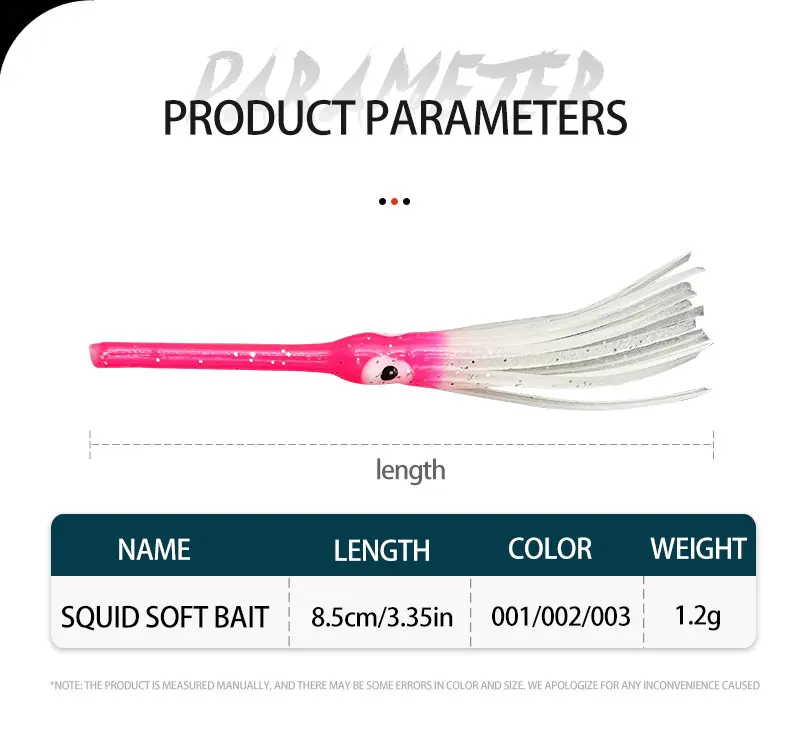 【Fácil de usar】:El cebo de falda de pulpo suave es fácil de conectar con el anzuelo, que es muy adecuado para la pesca del calamar. También es adecuado para la pesca de lubina, perca, salmón, trucha, marlín, atún. 【Personalizar】: Si personaliza el color y el tamaño, contáctenos, haremos el color y el tamaño que desee de acuerdo con sus requisitos. Nombre del producto Faldas de calamar suave boca larga Color 3 colores Longitud 8,5 cm/3,35 pulgadas