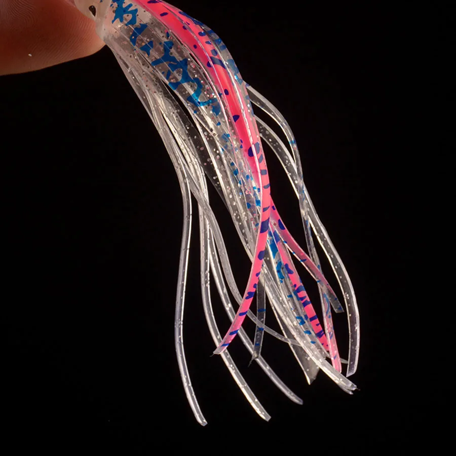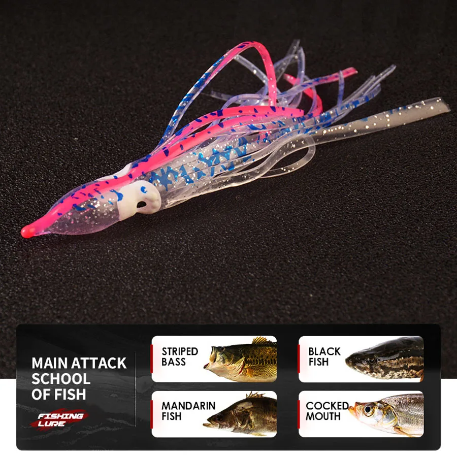 ESPECIES OBJETIVO AMPLIO: los señuelos de faldas de pulpo suaves son fáciles de conectar con anzuelos, adecuados principalmente para agua salada, apuntando ampliamente a peces depredadores como lubina rayada, salmón rey, atún, caballa, meros, etc.