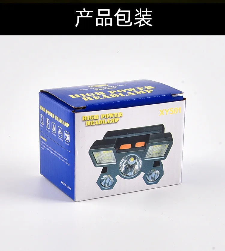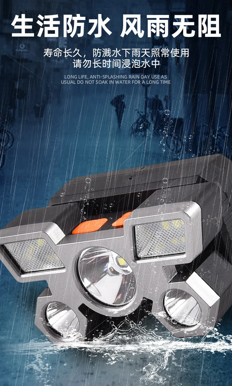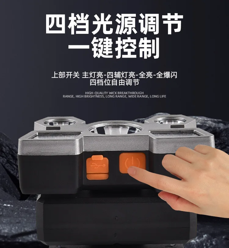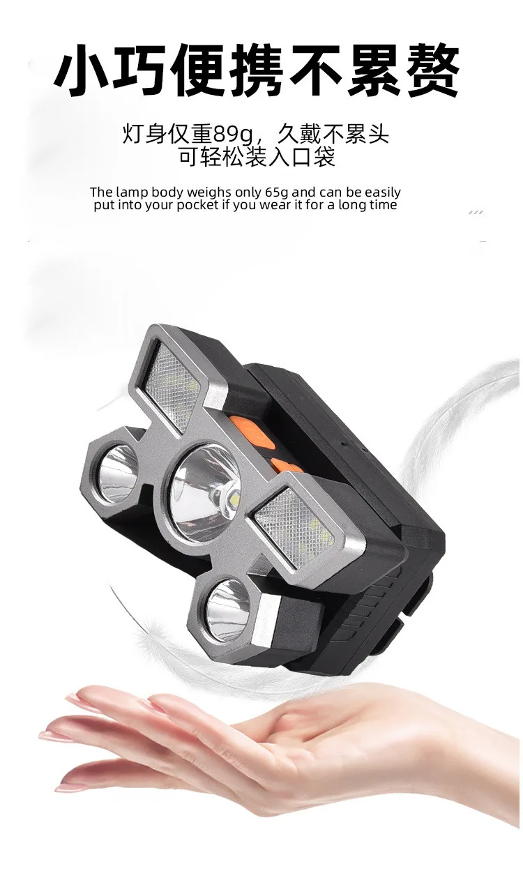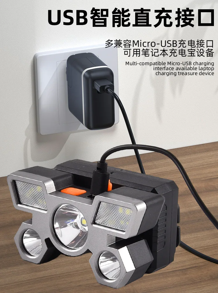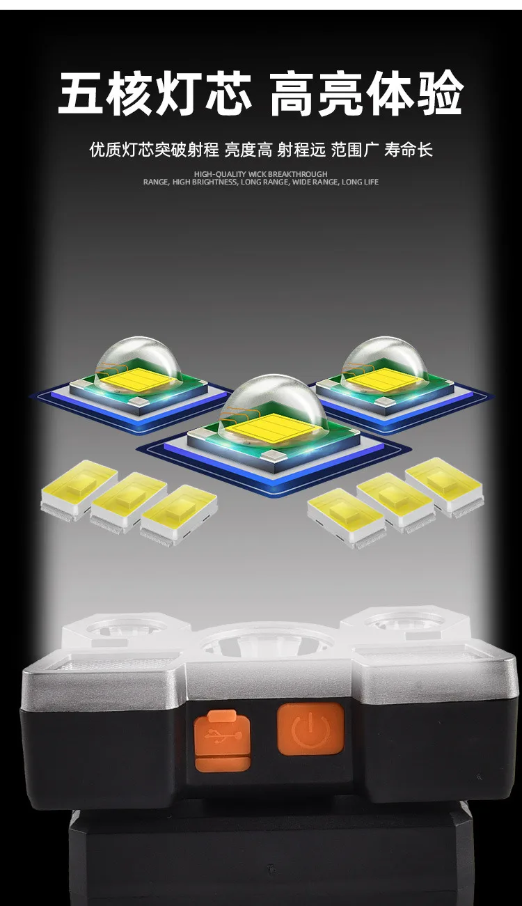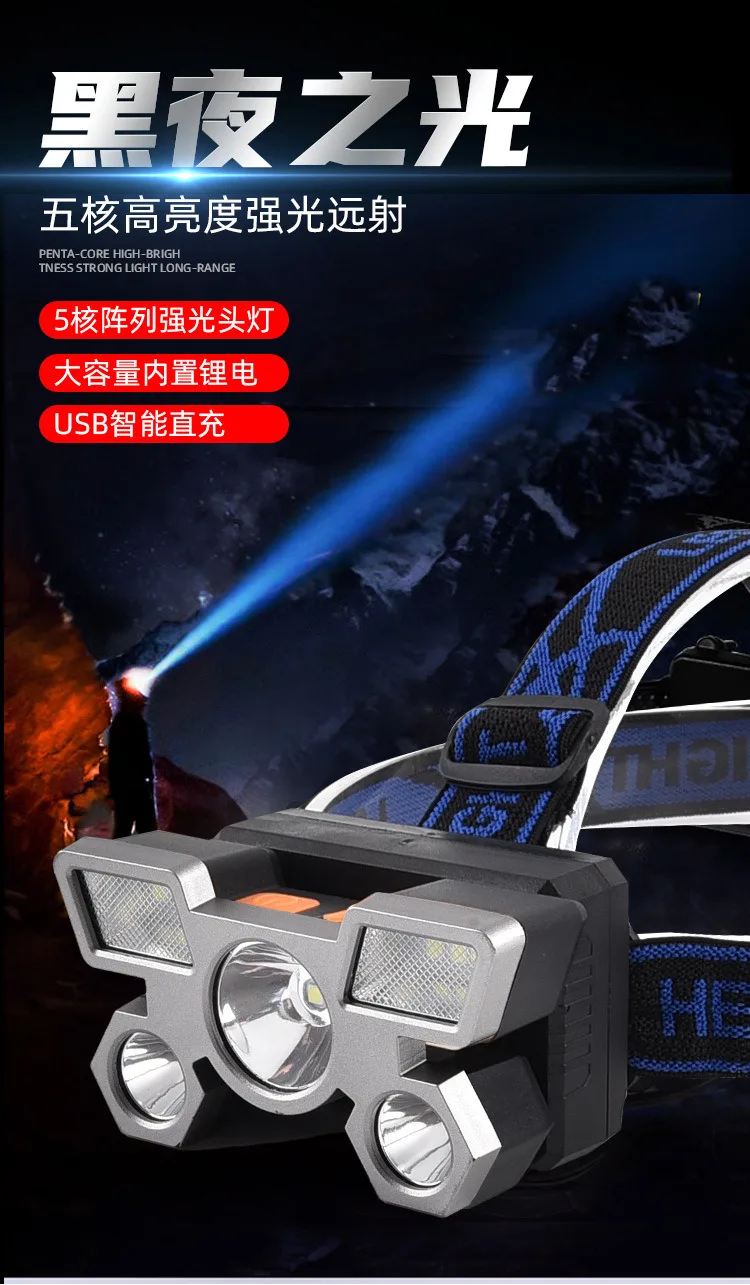 Faro Led de cinco cabezales, luz fuerte, superbrillante, lámpara de pesca recargable por USB, linterna de mina montada en la cabeza de largo alcance