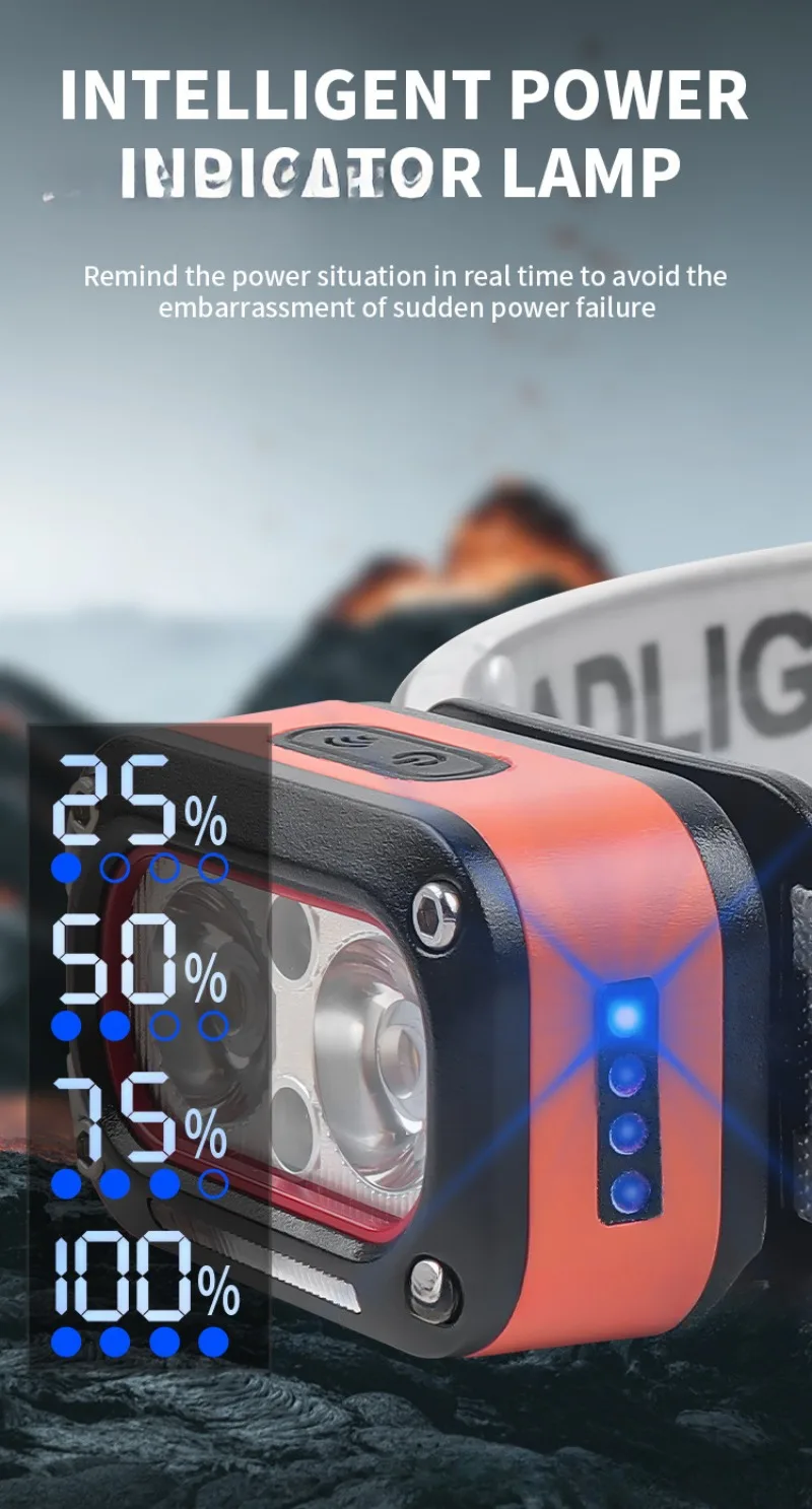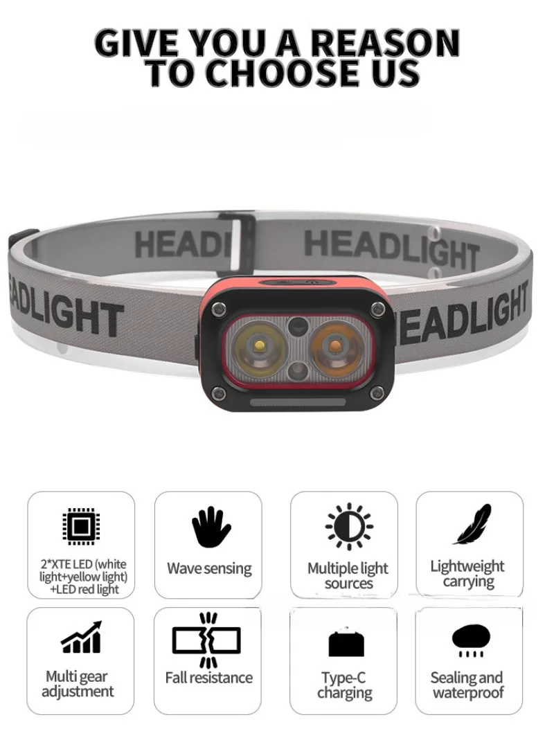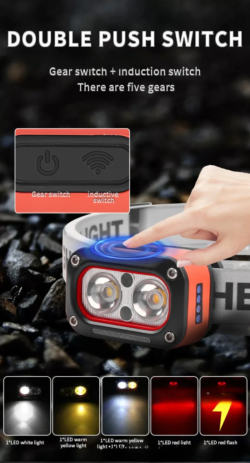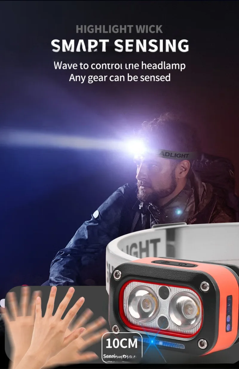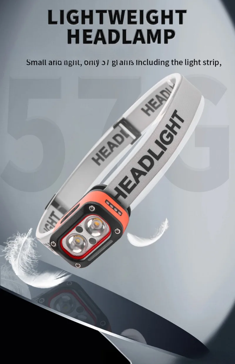 Faros LED de inducción de tres fuentes de luz, luces montadas en la cabeza de pesca para correr de noche al aire libre de larga resistencia, recargables