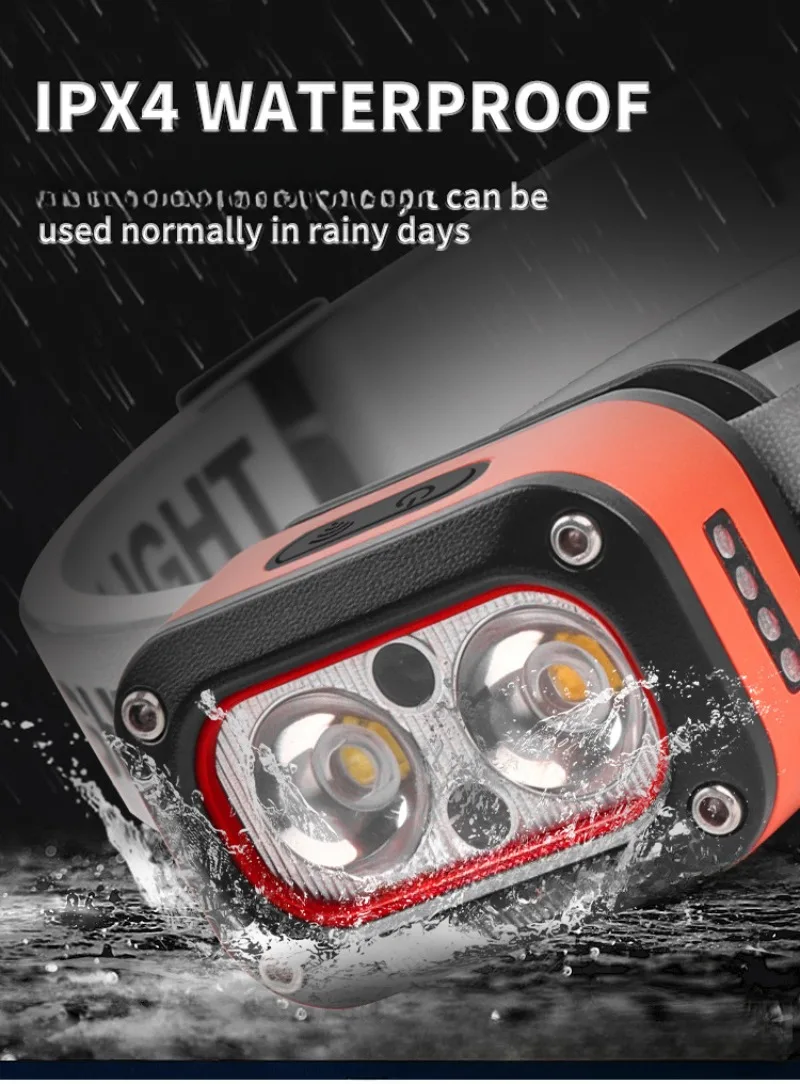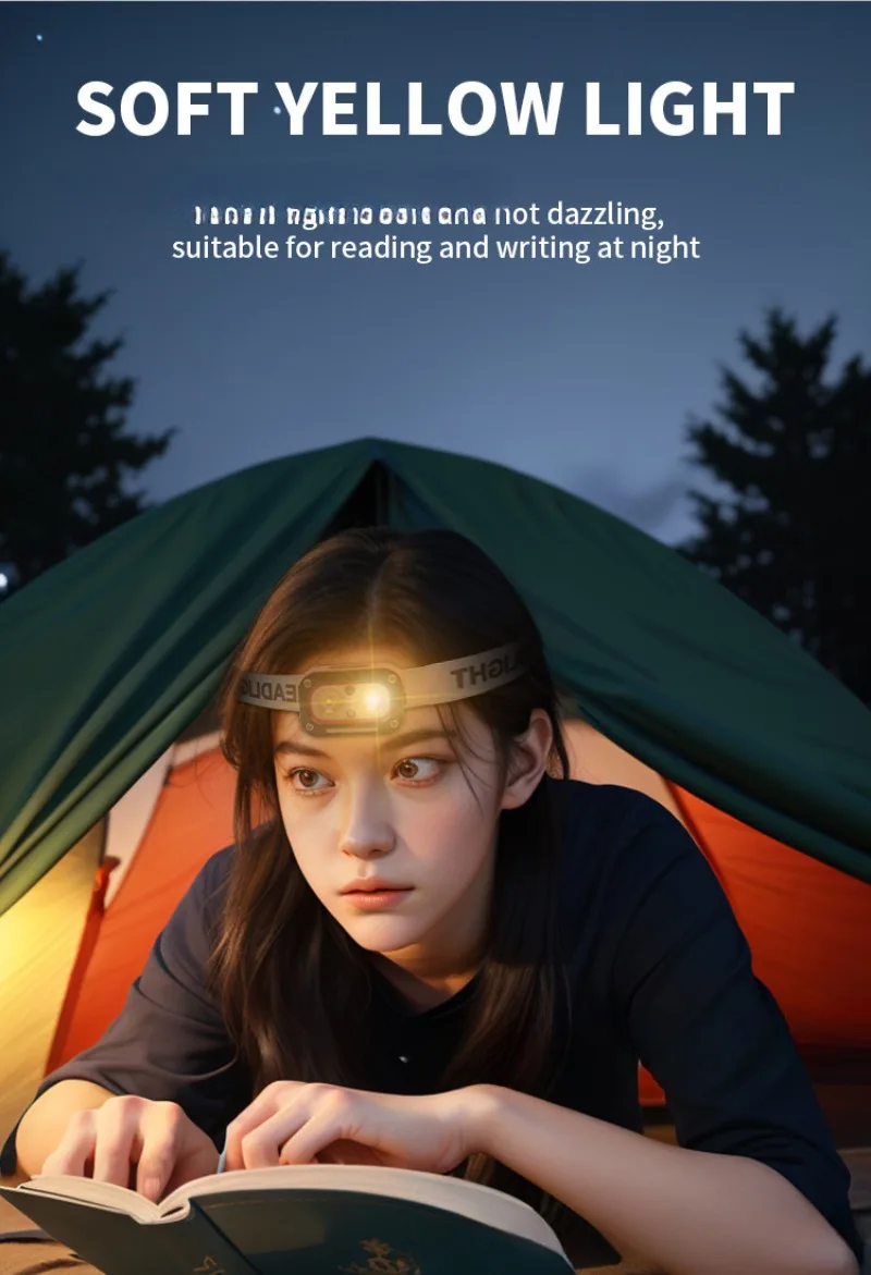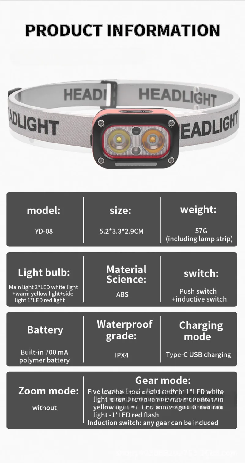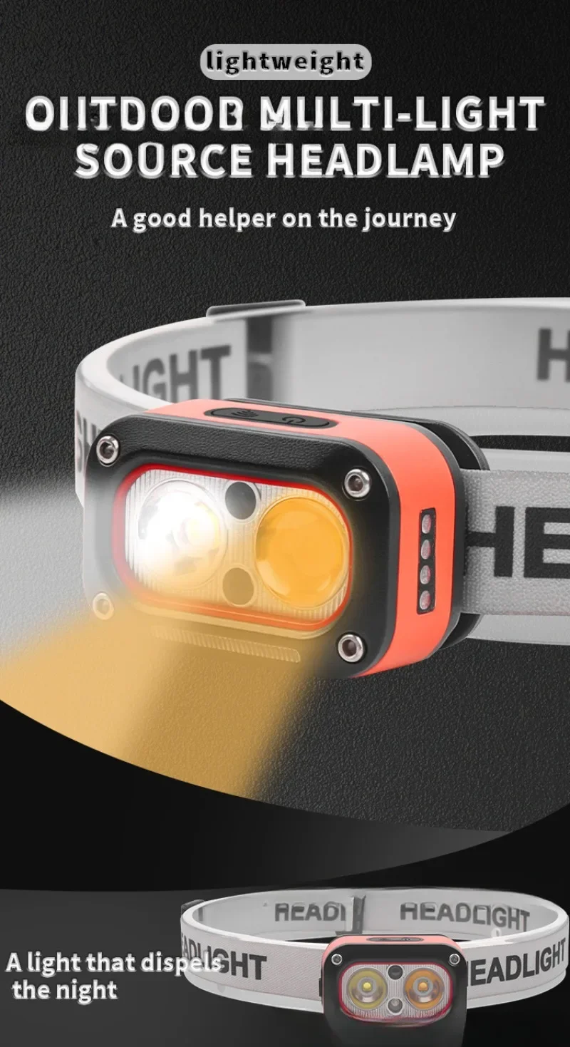 Faros LED de inducción de tres fuentes de luz, luces montadas en la cabeza de pesca para correr de noche al aire libre de larga resistencia, recargables