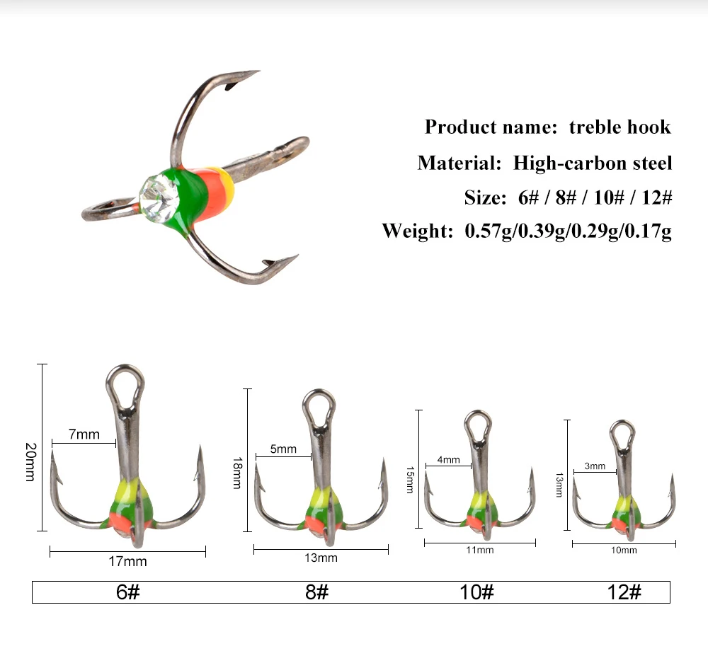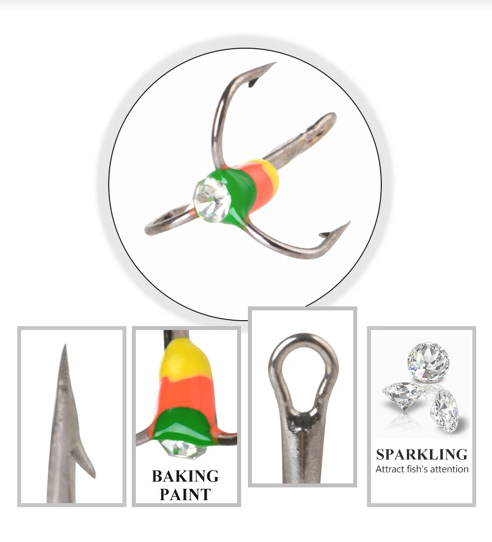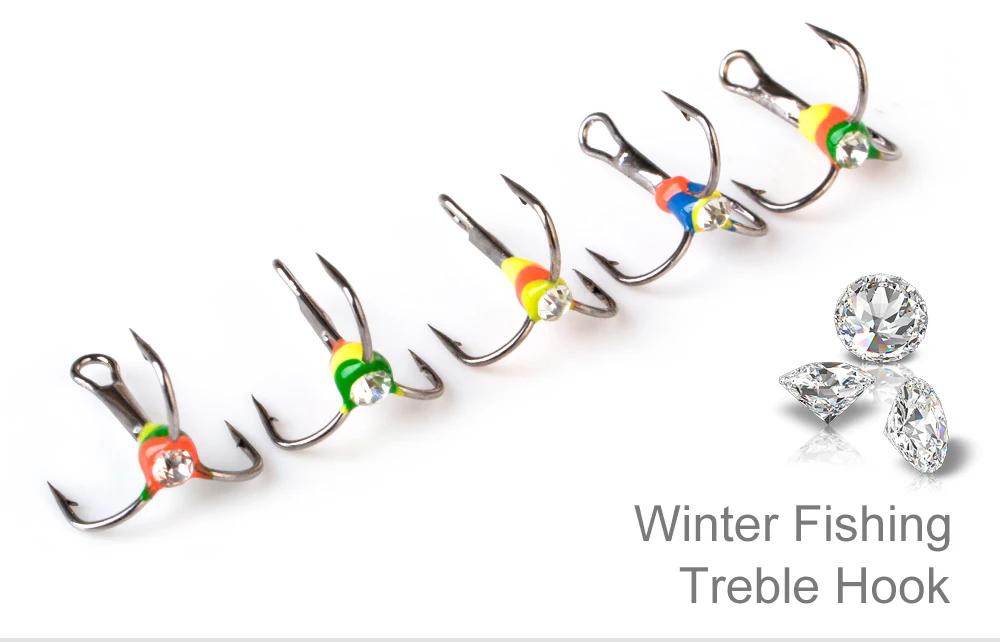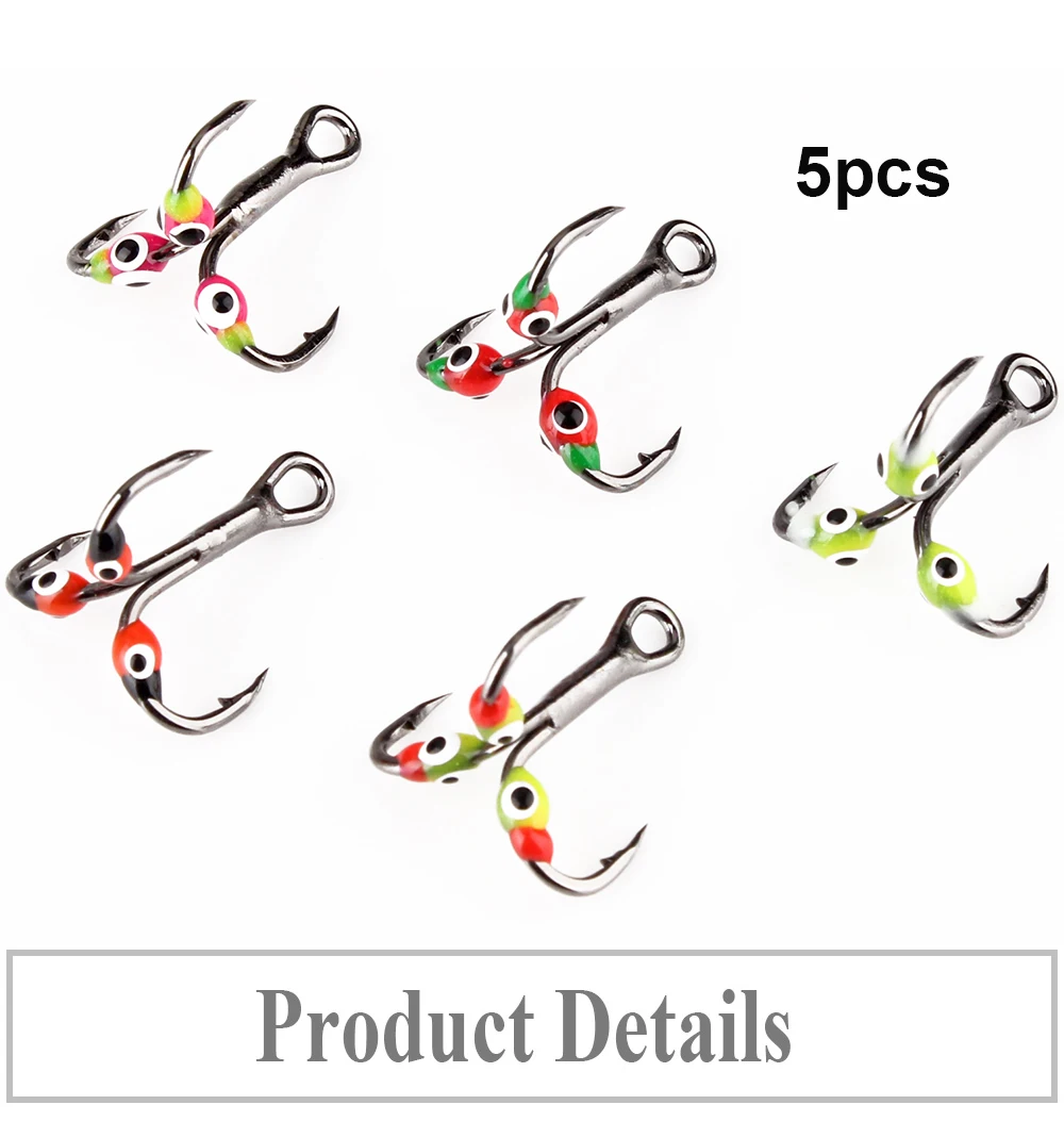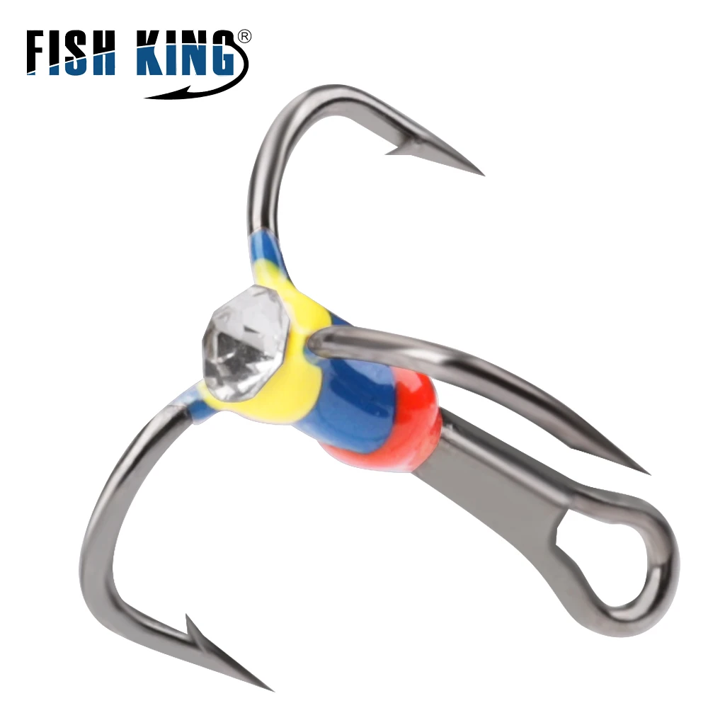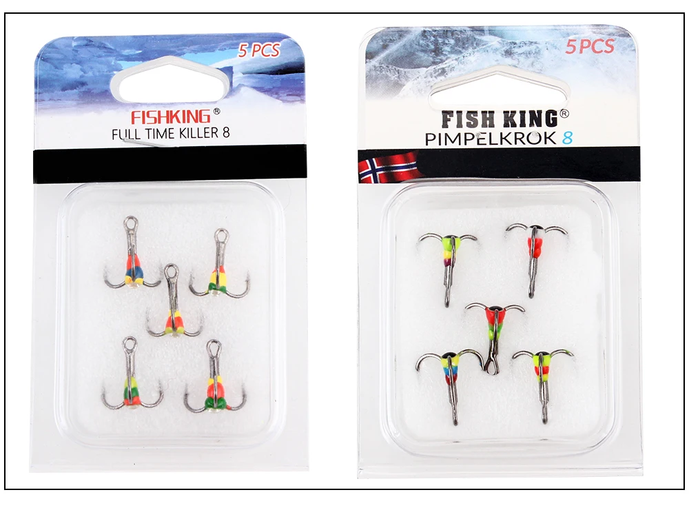 FISH KING-anzuelos de pesca en hielo de acero de alto carbono, 5 unids/lote por paquete, anzuelos triples de púas volteadas con ojo de diamante, aparejos de pesca