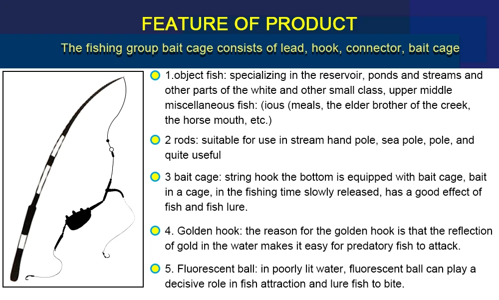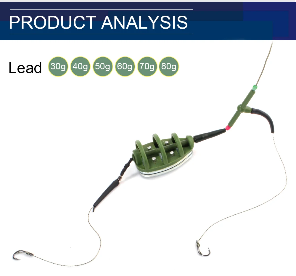3. Gancho de cuerda de jaula de cebo la parte inferior está equipada con jaula de cebo, cebo en una jaula, en el tiempo de pesca lentamente liberado, tiene un buen efecto de pez y señuelo de pez.